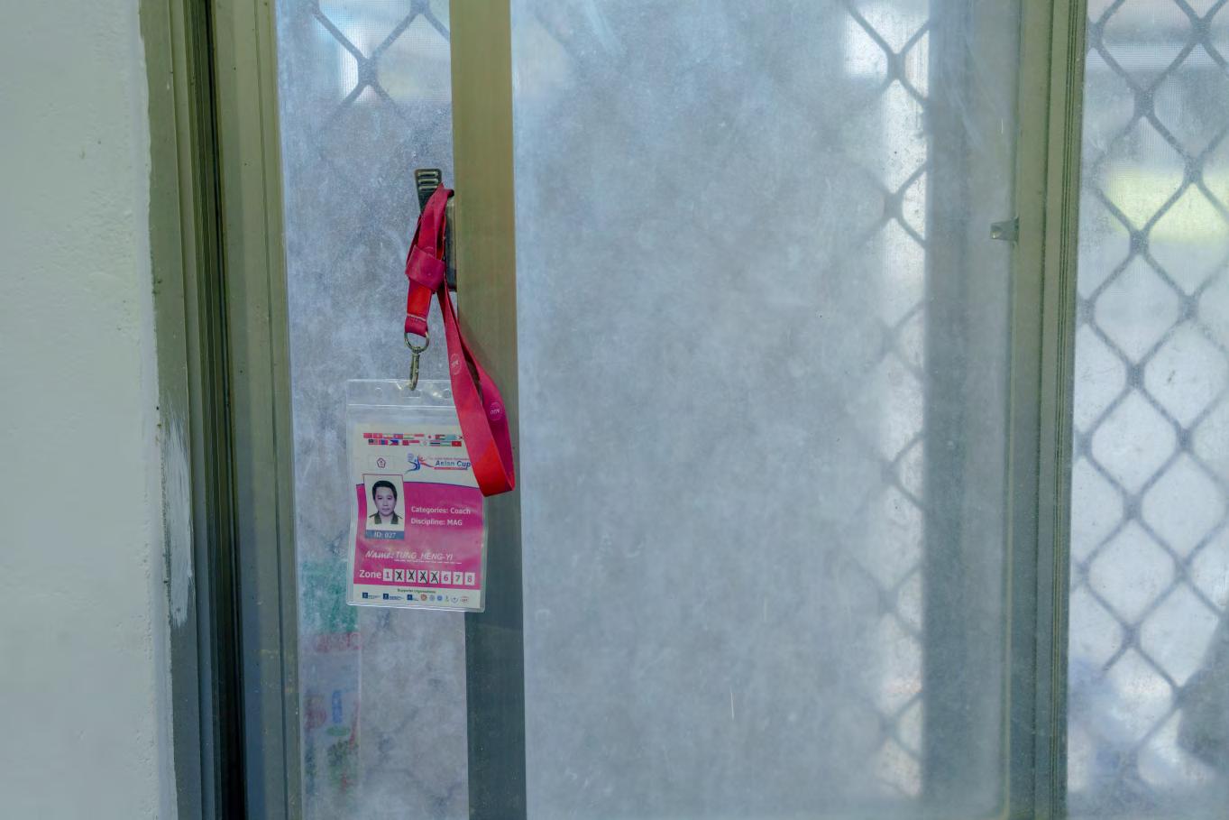 已故教練董恆毅的教練證,靜靜地掛在體操館窗戶上,守護著大家。