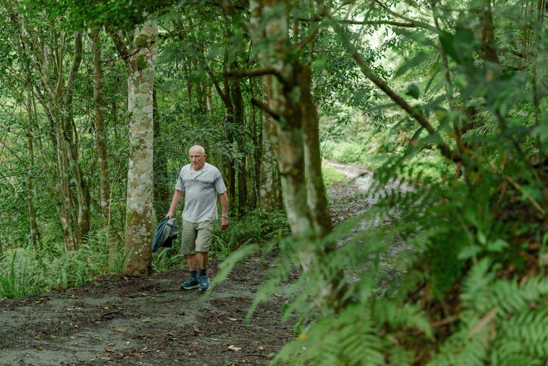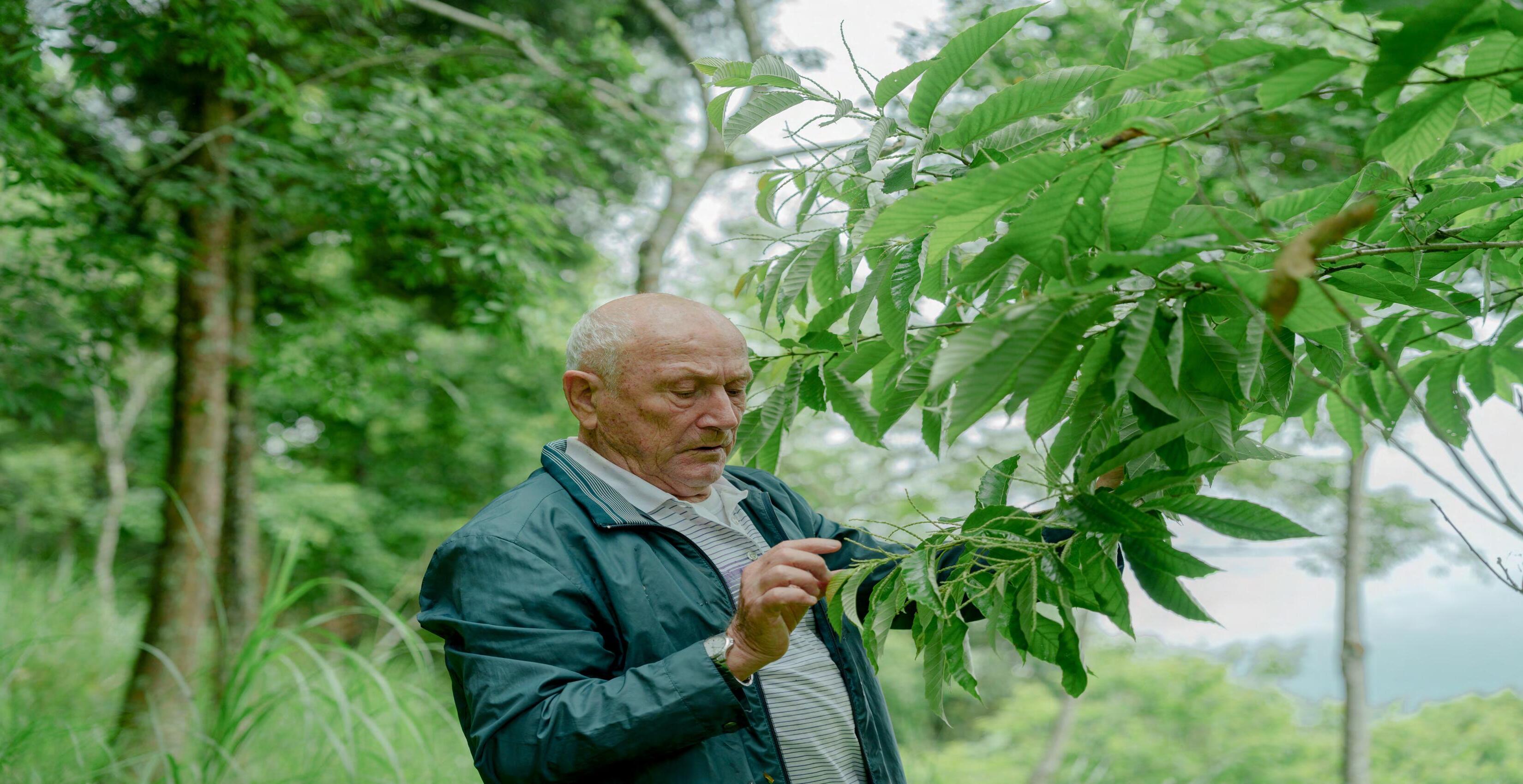 除了登山外,歐修士還擁有著不可思 議的綠手指。終於抵達傳說的秘密花園, 歐修士熱情地介紹:這是柿子、梨子、紅 肉李、野生芭樂、牛樟、洋玉蘭、夾竹桃 等,在幾乎沒有平路的小山坡,我們幾 近跟不上他靈活的腳步,這塊地是由登 山社社友捐贈,後由歐修士悉心照料, 成為一片擁有豐富動植物多樣性的小 天地。無論是對山的迷戀亦或對樹的深 情,以生命呵護生命,似乎就是歐修士 的畢生使命。除了這片秘密花園外,歐 修士種樹的足跡遍佈整個臺東市,杭州 街上與湧泉游泳池邊粗壯的老茄苳就 是由歐修士親手種下。