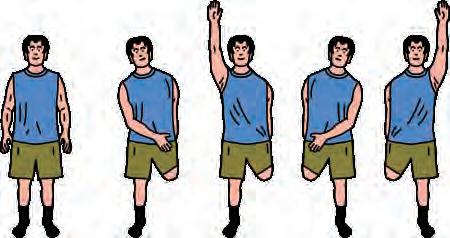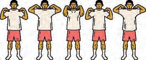 兩手點肩,手肘往外拆解成四個方向,往前、往 上、往下、往後畫圈,可以逐漸將圈畫大。往前 做完後,往後畫圈將關節充分拉伸。