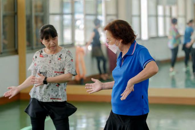 但愛之深責之切,中場休息結束後,高 秀嬌又招呼大家回到教室內,準備練習 年中要發表的�分鐘組曲。「脖子伸出 來」、「��度轉身」、「腳尖要踏勾、退、 點」,高秀嬌宏亮的嗓音再次在教室裡 響起,學員們也都努力跟上。這些來到 長青學苑的姐姐、媽媽、阿嬤們,只要一 跳起舞來,每個人都是青春洋溢。