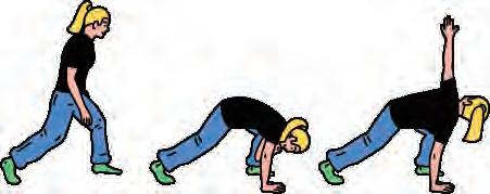 兩腳與肩同寬,跨出一個弓箭步重心放在前腳,後腳腳跟離地 以踩地的對稱手撐地(例如左腳踩地右手撐地) 用同側手肘外側觸碰同側腳踝內側,吸一口氣後,吐氣把那隻 手垂直往上延展,眼睛看向指尖,身體旋轉回來兩手撐地,再 起身回到原位起始動作。