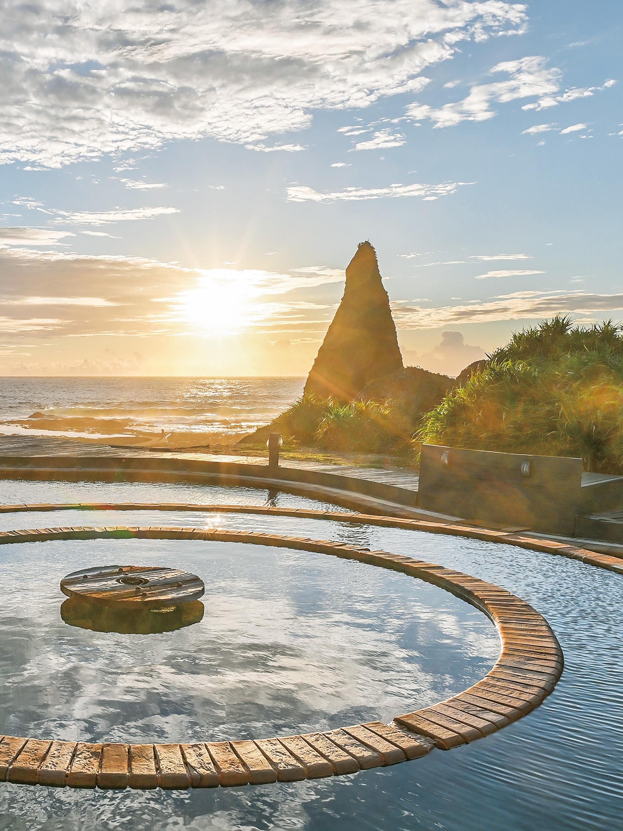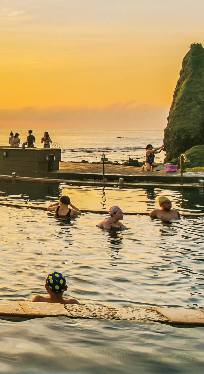 溫泉靠海交融 , 海浪拍岸 、 泉水翻湧 , 旅人泡湯看著潮 起潮落 , 盡享南迴自在節奏 。 栗松溫泉隱於山谷深處 ,