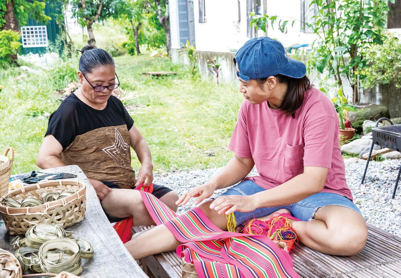 都蘭的午後陽光灑在手指與勾針上 , 十字 繡在細碎的光影中舞著文化的步伐 。 從小 看著長輩在屋外圍坐成圈 , 邊聊天 、 織布 及編籃 。