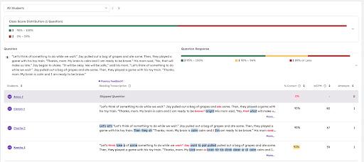 Reading Fluency tracks key metrics, like percent of words correct, words correct per minute, word additions, word removals, and more.
