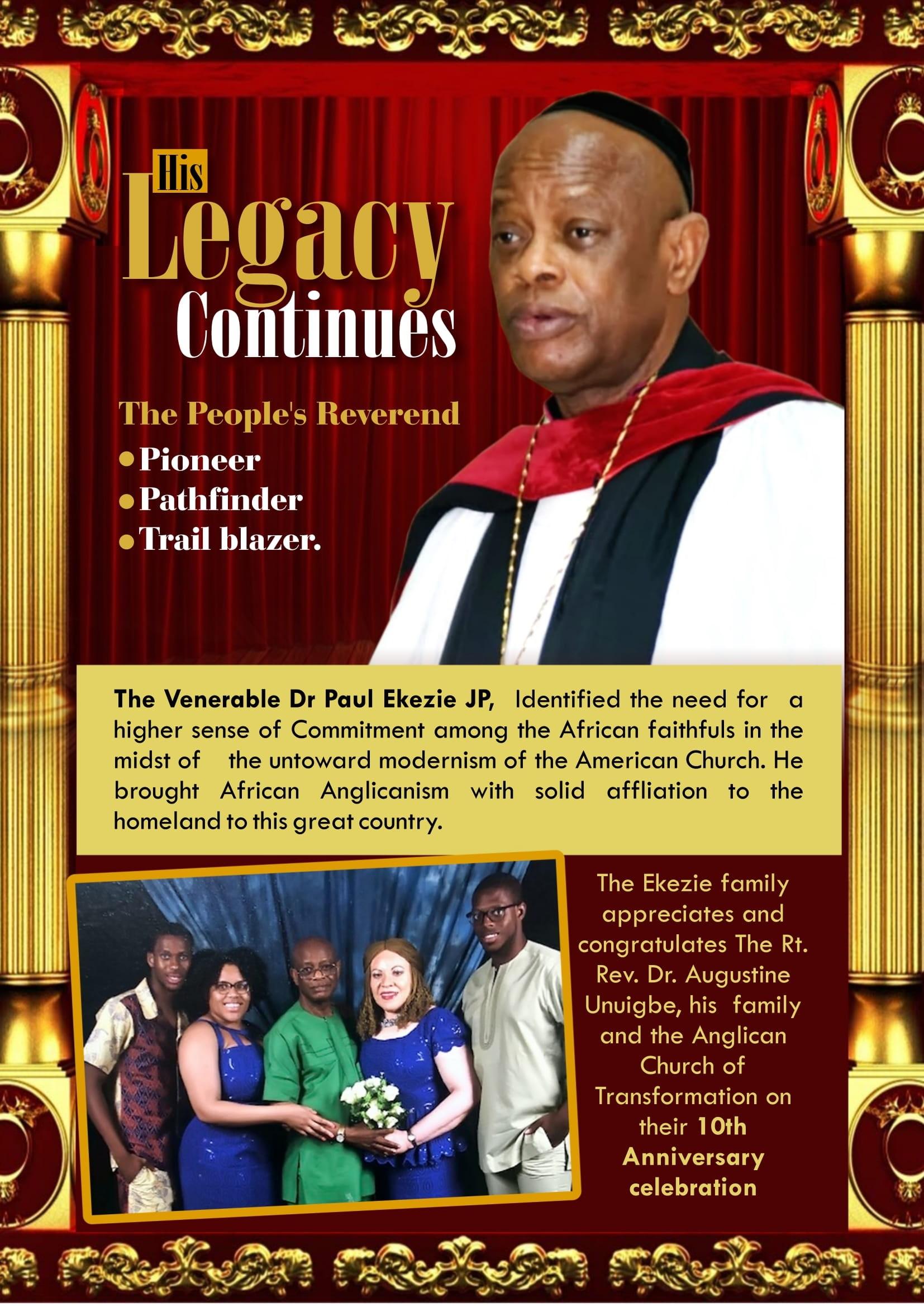 I,theReverendCanonPaulObikeandtheentiremembershipof theAnglicanChurchoftheAscension,LongIslandNY congratulatetheRt.Rev’dDr.AugustineUnuigbe andthemembersoftheAnglicanChurchofTransformation ontheir10year’sanniversarycelebration.