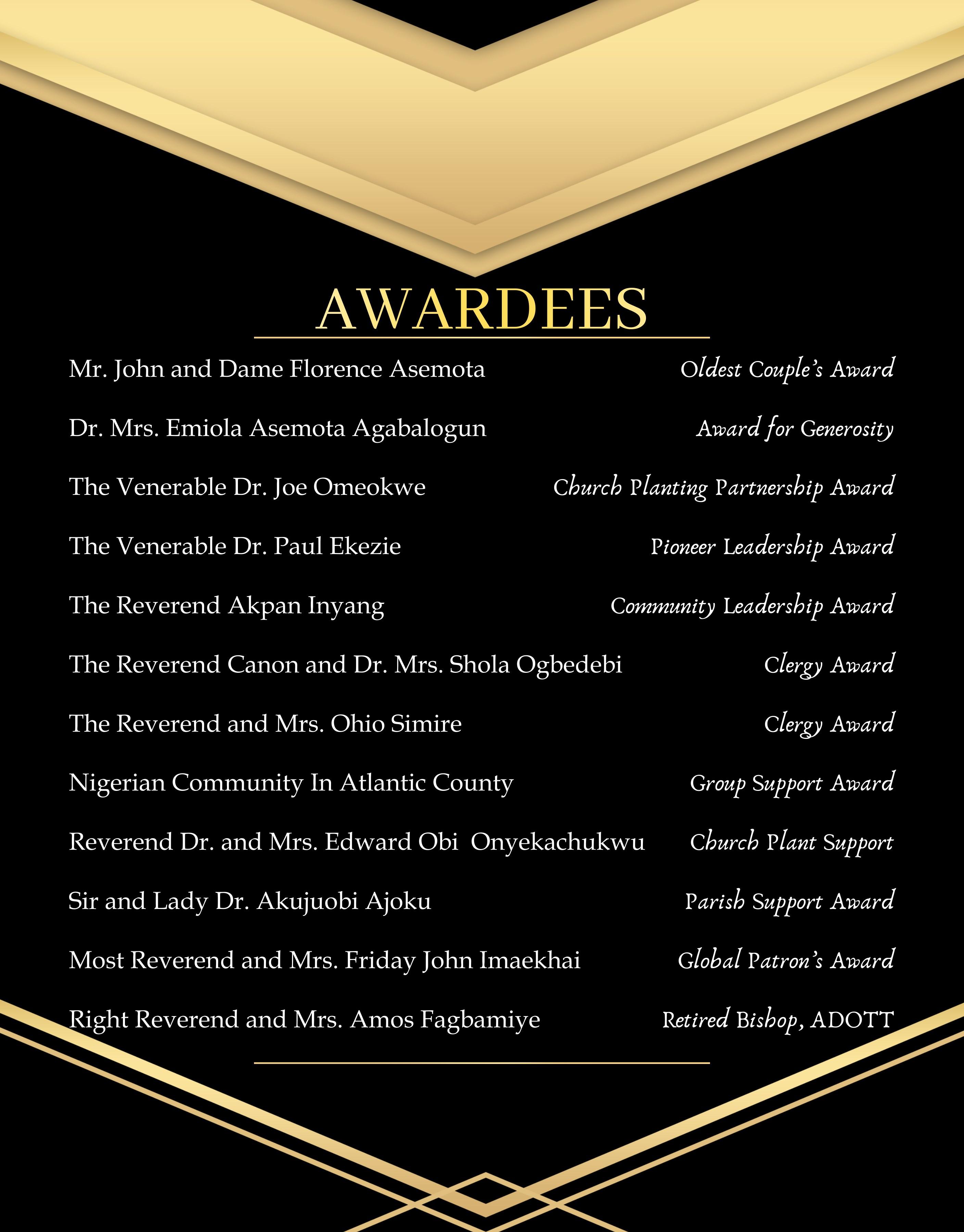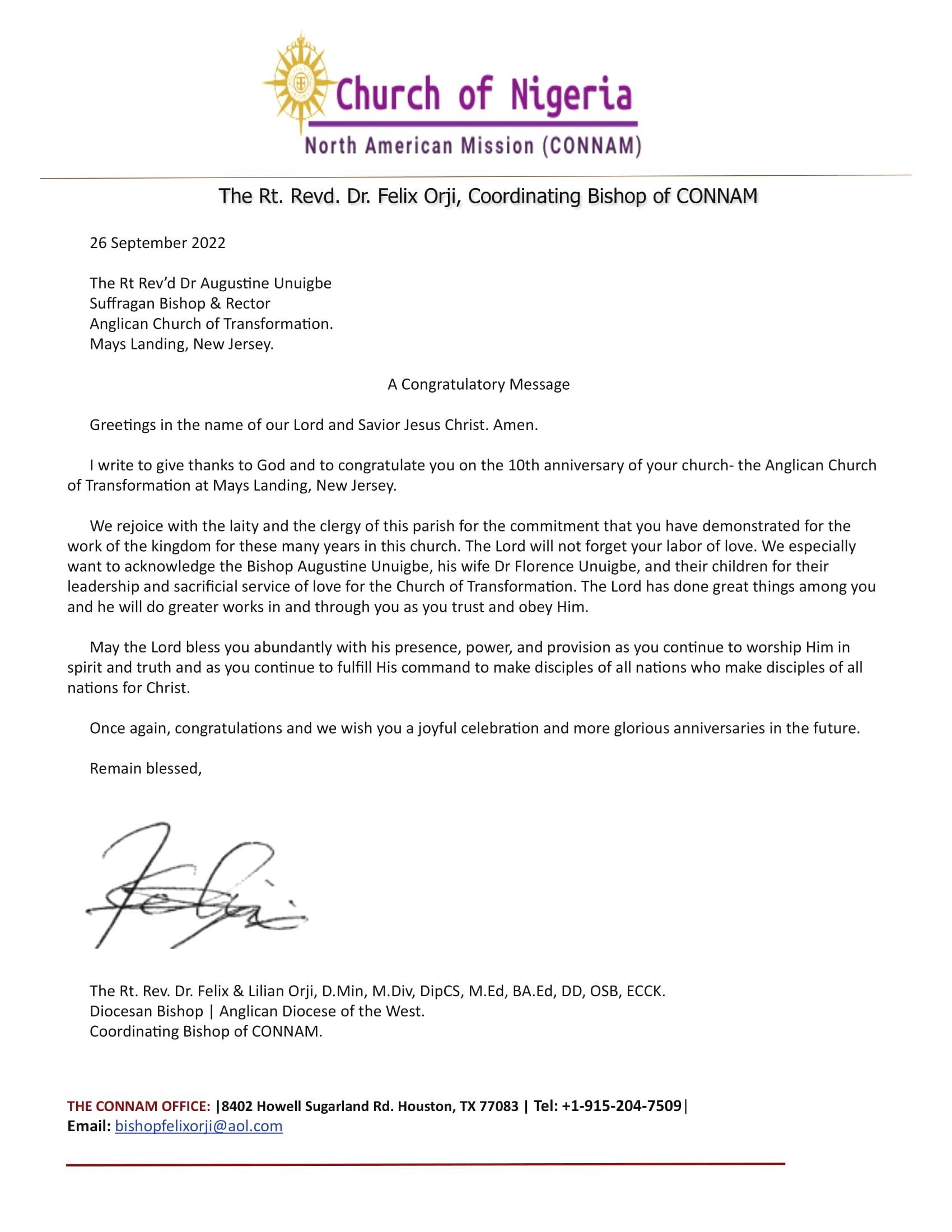 OnbehalfofmyfamilyandmembersofAnglicanChurchoftheResurrectionNewarkNJ, wecongratulatetheRt.Rev.Dr.AugustineandDr.Mrs.FlorenceUnuigbe theBishopSuffraganADOTTRegion 4,the10thanniversaryplanningcommittee andallthemembersofAnglicanChurchofTransformation,Mayslanding onthe10thAnniversarycelebrationandAwardnightofyourchurch. WishingyoumanymoreblessingsintheserviceofGod.