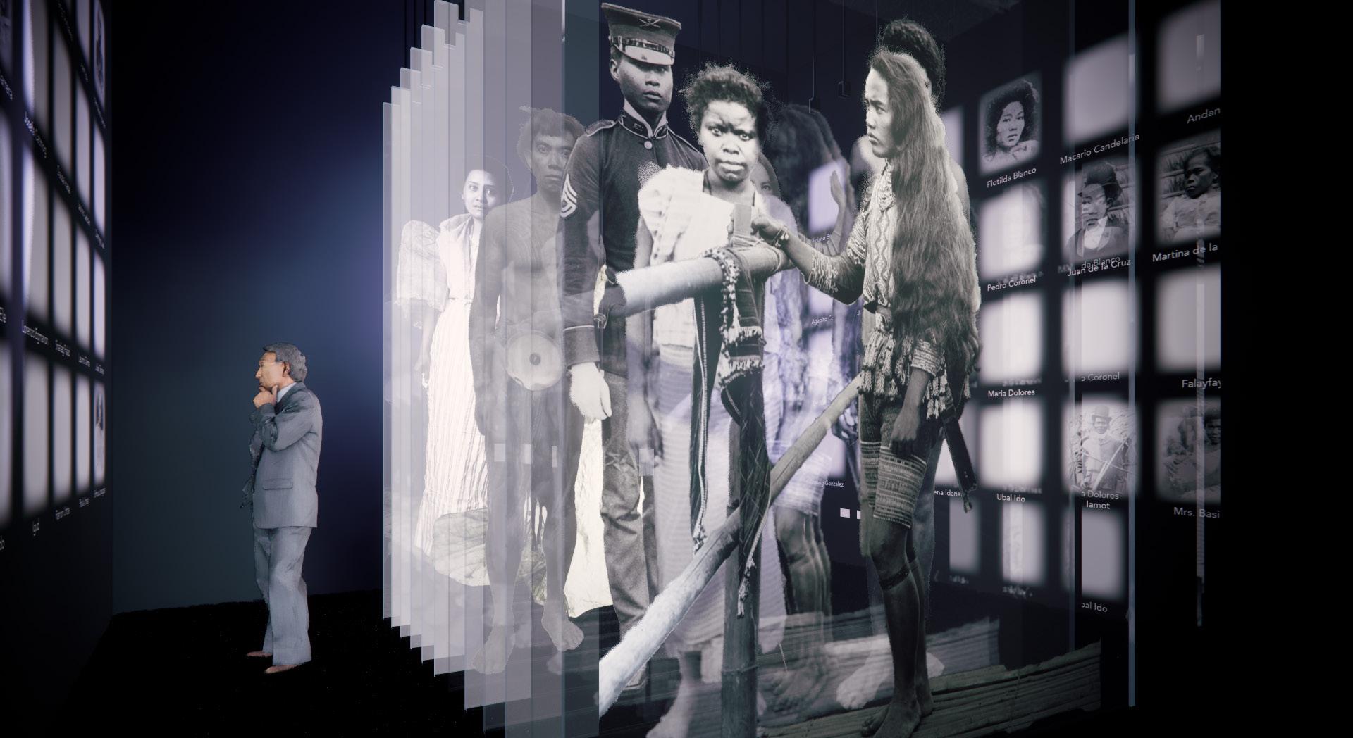 THE 1200 / SANLIBO AT DALAWANDAANG TAO: Life-sized portraits of Filipinos from the Philippine Village emerge through layered acrylic panels using Smart Film technology. As electric signals activate each panel from opaque to transparent, a single light source casts celestial patterns through 14 layers, creating a meditation on presence and absence. St. Louis-based Filipina artist Janna Langholz’s research to identify these individuals is projected on surrounding walls, though many faces remain unnamed despite her extensive archival work. This immersive environment offers contemplative space to reflect on lives lost during the fair— while some stories are preserved and others recovered through Langholz’s work, much remains unknown, a powerful reminder of our stories both remembered and lost.