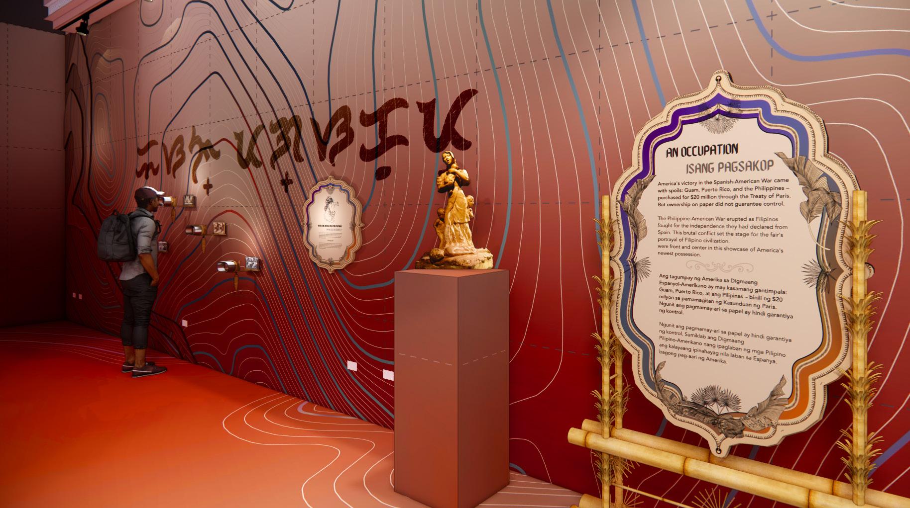 AN OCCUPATION / ISANG PAGSAKOP: Archival stereoview photographs reveal “peace time” Philippines, while contrasting freedom symbols frame the space: Thomas Crawford’s “Statue of Freedom” (1863) and Fermin Gomez’s “A Plea for Freedom from Fear” (1949). The interactive “How to Hide an Empire” maps U.S. colonial scope, alongside a lenticular image transitioning between the Treaty of Paris and Louisiana Purchase. NMAI objects connect parallel indigenous experiences of American expansion, presented on drafting tables emphasizing the exhibition’s planning and cartography theme.