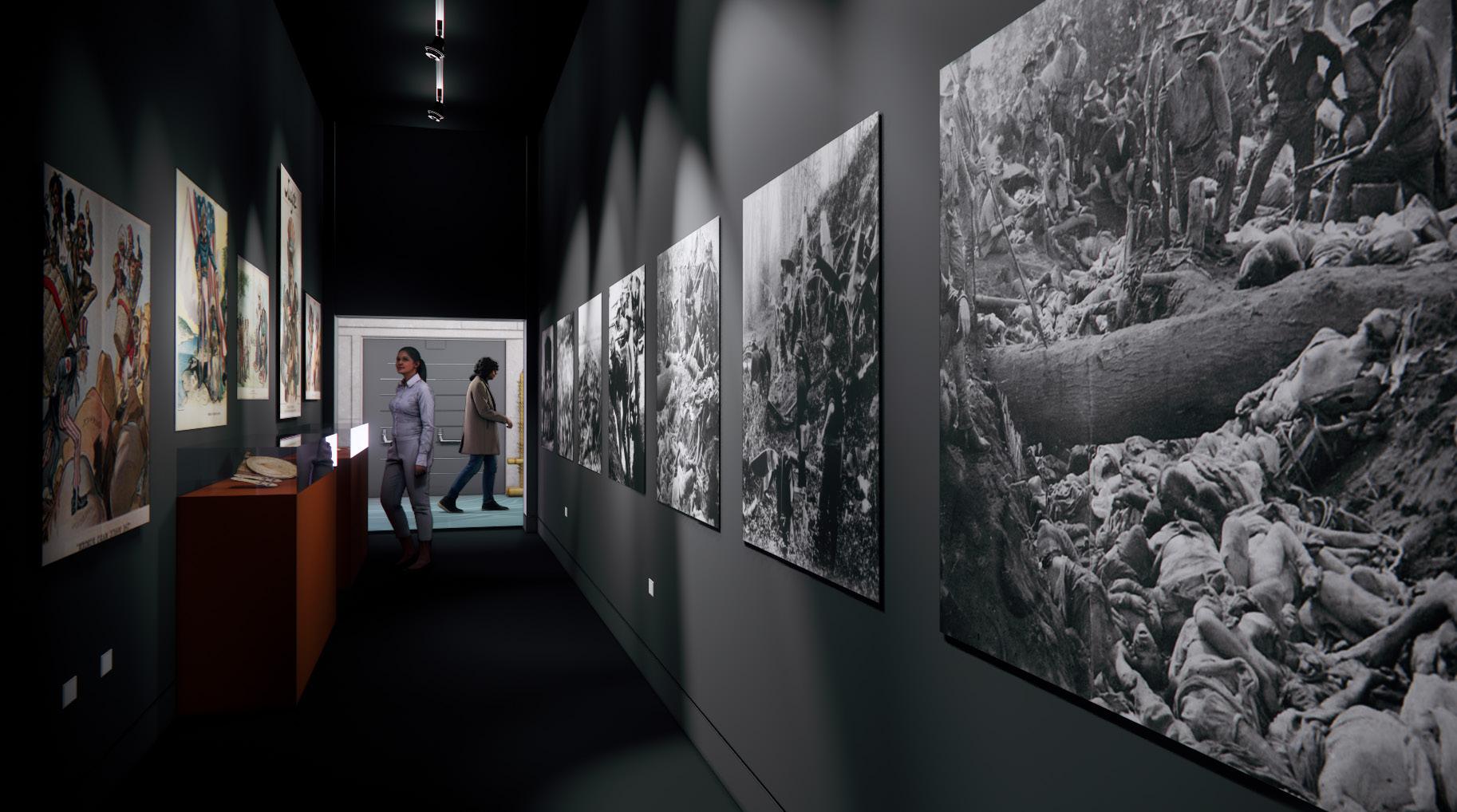 A central triangular installation displays the Balangiga Bells, taken by American troops after the Balangiga massacre. This serves as a starting point to explore conflicting symbols of freedom. In the adjacent section, a photograph of the Liberty Bell at the St. Louis World’s Fair creates dialogue between these contested symbols.