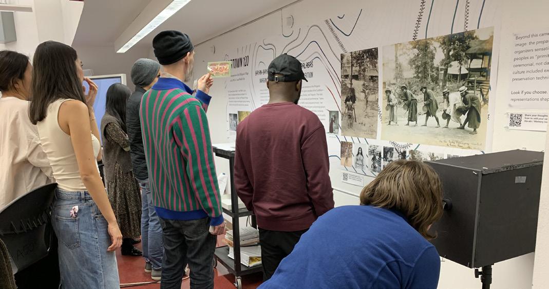 A rapid prototype testing was conducted in the FIT Exhibition and Experience Design Studio, exploring how different presentation methods of historical photographs could create moments of wonder while engaging with the difficult history of the 1904 Philippine Village. The testing environment integrated three key technological approaches arranged to support Quacchia’s aura-awe-wonder sequence: an antique stereoscope with historical photographs, a box camera mock-up with digital display, and large-format archival prints juxtaposed with smaller prints.