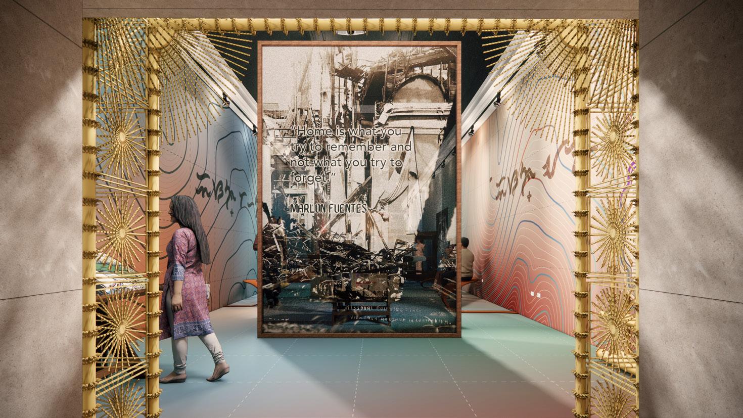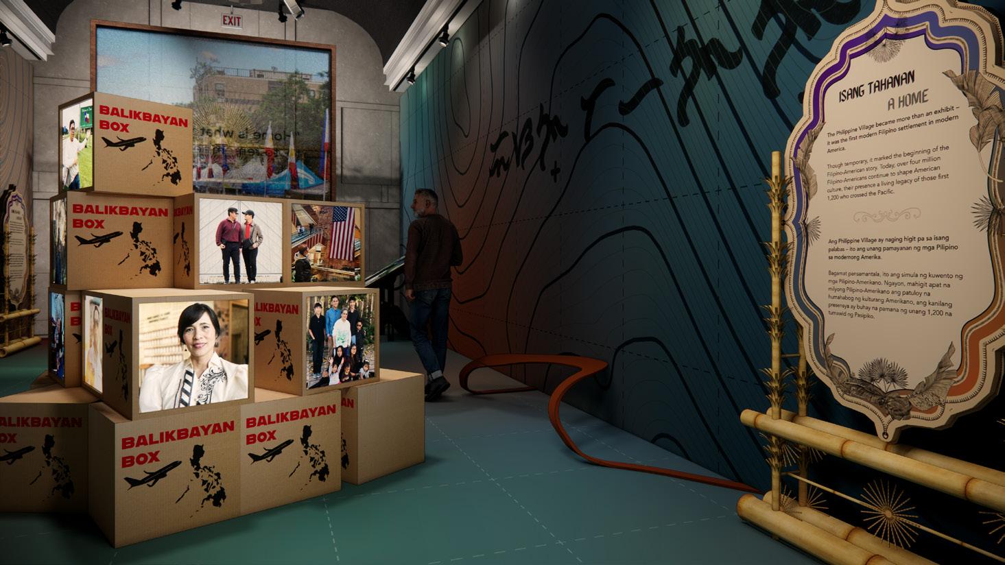 A HOME / TAHANAN & A MEMORY / ISANG ALAALA: The Philippine Village may represent the first Filipino settlement in modernday America. This section explores its lasting legacy through audiovisual installations featuring Filipino-American narratives, including artist Ria Unson’s connection through her grandfather who participated, and Jana Langholz’s vision for the “Philippine Village Historical Site.” Video screens framed by “Balikbayan Boxes” represent the multi-billion dollar industry of Filipinos sending goods to their homeland. An interactive drafting table asks “Where are they now?” showing Filipino-American population density after visitors enter their ZIP code. The exhibition concludes with video installations showing historical post-fair images and demolition of the grand structures, projected onto transparent fabric screens where the St. Louis World’s Fair site now stands as Forest Park. Online visitors respond to questions like “What makes a home?” while a drawing board interactive showcases contemporary interpretations including Filipino artists’ works like Marlon Fuentes’s documentary film “Bontoc Eulogy.”