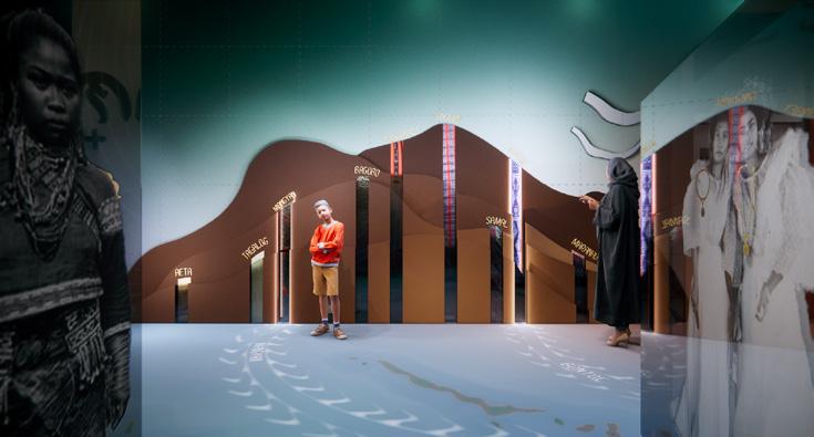 IMAGINING A NATION / BAYAN-BAYANAN: Images of Filipinos taken during the occupation serve as backdrop for artifacts collected from the same period, displayed in cases placed over a floor map that is mirrored by the same map rendered in green-edged clear acrylic on the ceiling. On the left wall, an interactive mountain installation presents the 10 ethno-linguistic groups brought to St. Louis, lighting up with proximity sensors that reveal indigenous weaves, while graphic projections on the floor connect these weaves to the map, locating the homes of the people who make them. The interactive “Design Your Own World’s Fair” allows audiences to learn about the fair’s design while exploring how exhibition and spatial design communicate meaning, influencing our perception of the world around us. Stereoviews display archival images from the 1904 Philippine Village, while the artifact display showcases the immense wealth of weapons and forms of cultural and personal expression rendered in gold, trade beads, hardwood, textile, minerals and more—treasures that made the Philippines America’s new great possession, all destined to be showcased at the 1904 St. Louis World’s Fair.