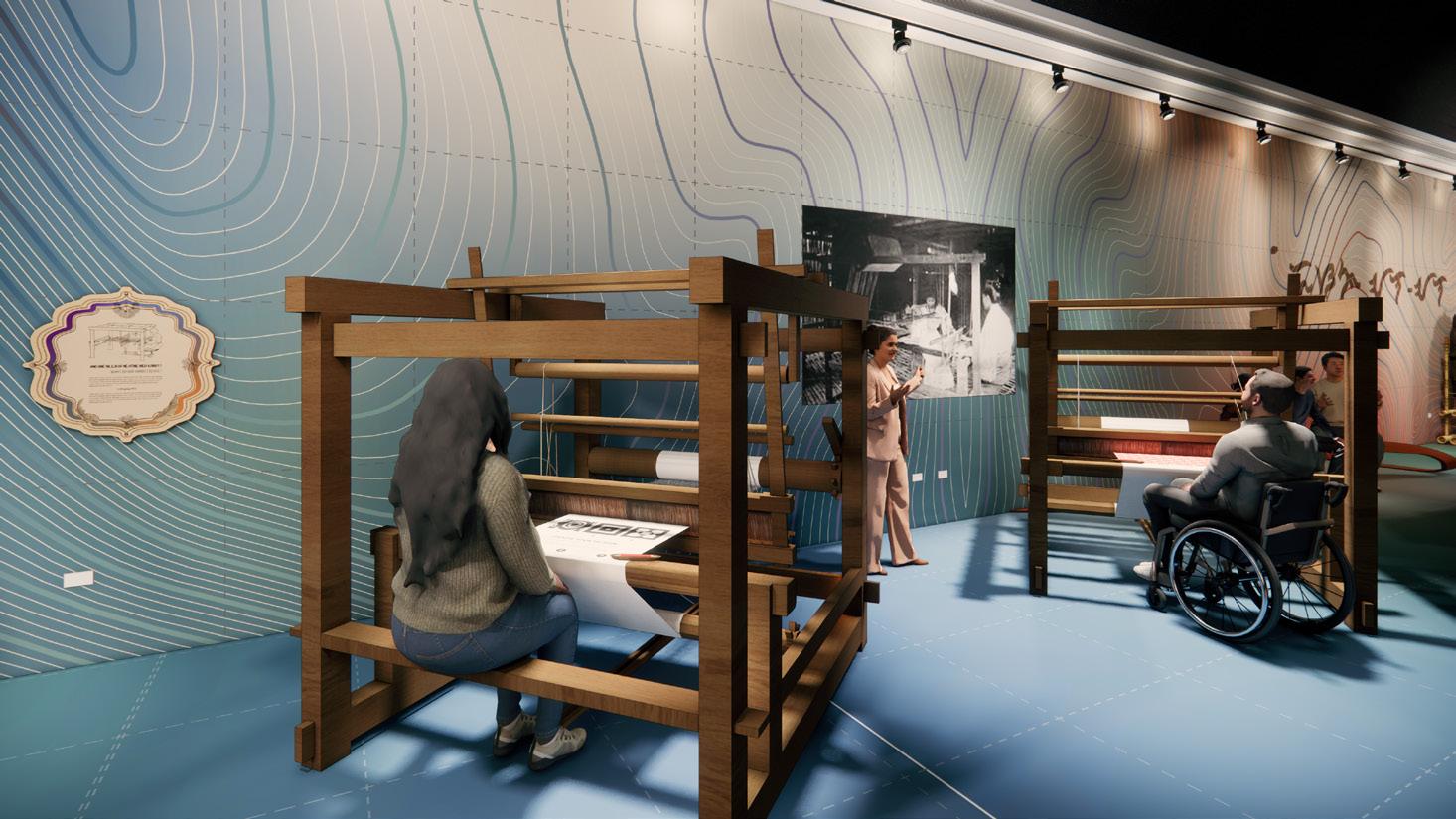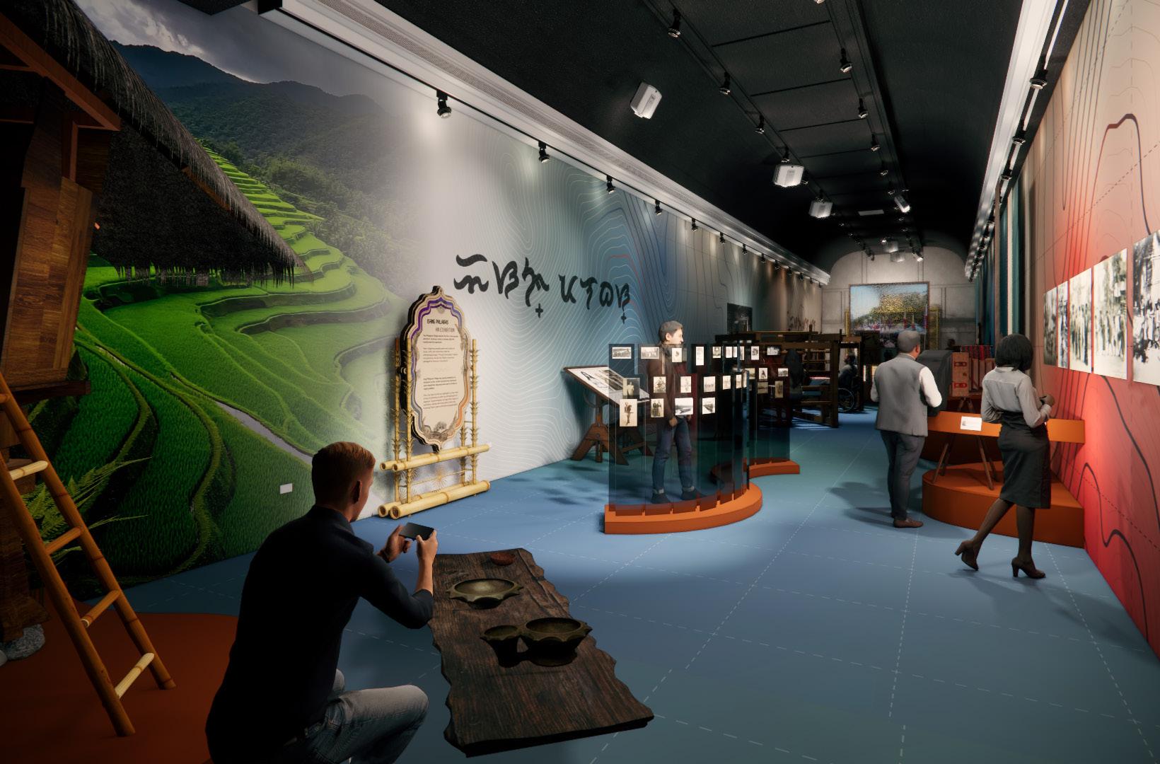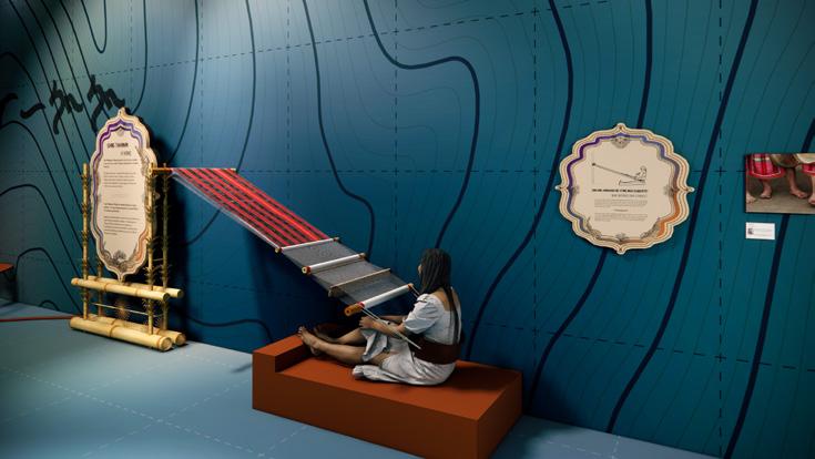 AN EXHIBITION / ISANG PALABAS: This section presents the most popular exhibition of the 1904 World’s Fair through village recreations and original fair ephemera. A Cordillera house marks the opening, featuring authentic regional bowls known for their ergonomic quality—visitors discover these hardwood bowls’ sophisticated balance and handling, countering racist fair portrayals. Layered archival images and postcards in acrylic panels reveal handwritten notes, while an interactive box camera station lets visitors create and email their own postcards, echoing a practice from the village era. Selected fair images are enlarged, with sensitive content like “Igorots killing a dog” viewable only through an optional box camera display. Two weaving interactives teach textile traditions: a counterbalance loom typical of lowland regions in “What Do We Create?” where visitors use a shuttle to trigger projected patterns, and a portable backstrap loom in “Who Weaves Our Stories?” where visitors experience tension by sitting with the strap around their waist. These experiences not only teach about craft but place audiences in the position of being exhibited, much like the original fair participants, showcasing the rich culture of making that provided one of the few opportunities for personal agency at the fair.