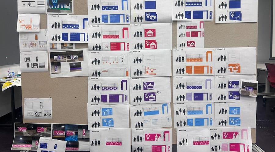 Selected concepts were further developed into detailed proposals. Students produced both physical prototypes (such as scaled models and mockups) and digital renderings to simulate the integration of experiential graphics within the existing architecture of the parking garage.