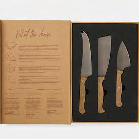Ostsetet innehåller en dubbeltandad ostkniv, en cheddarostkniv och en parmesanostkniv i rostfritt stål och akaciaträ. Elegant förpackat i en presentkartong som liknar en klassisk bok.