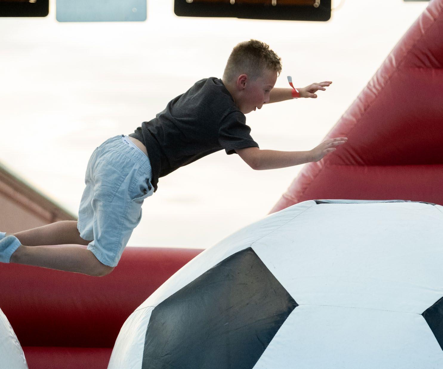 The bounce house play area will include slides, obstacle courses, and more. Parents are encouraged to dress children in socks, as they are required on the equipment.