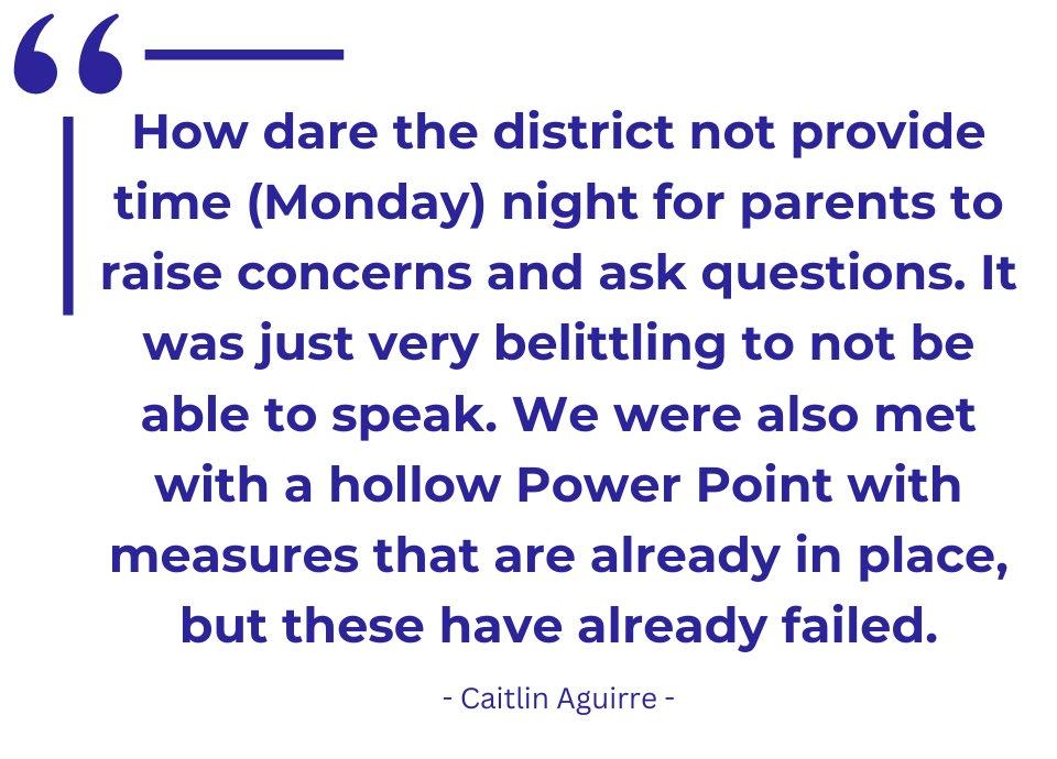 “I would like the chance to express a few of my concerns after (Monday’s) town hall meeting, which was more of a, you listen and we talk. I am highly disappointed in our administration with how this was handled – the fact of the matter is, the staff at the meeting had more safety measures put in place than our own students have during school hours. I want to say, how dare the district not provide time (Monday) night for parents to raise concerns and ask questions. It was just very belittling to not be able to speak. We were also met with a hollow Power Point with measures that are already in place, but these have already failed,” said Aguirre.