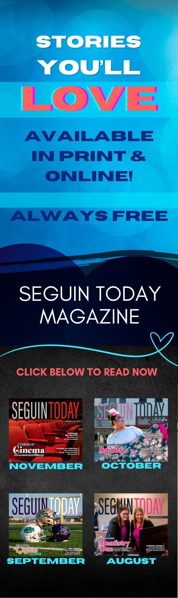 The City of Seguin will host a Complimentary Thanksgiving Meal on Sunday, Nov. 24th, from 3 - 6 PM at the Seguin Coliseum. Approximately 1,000 plates will be served on a first-come, firstserve basis. All are welcome, and no registration is required. In addition to a delicious meal, there will be activities for kids. If you would like to make a donation or volunteer, sign up at https:// thetableseguin.com