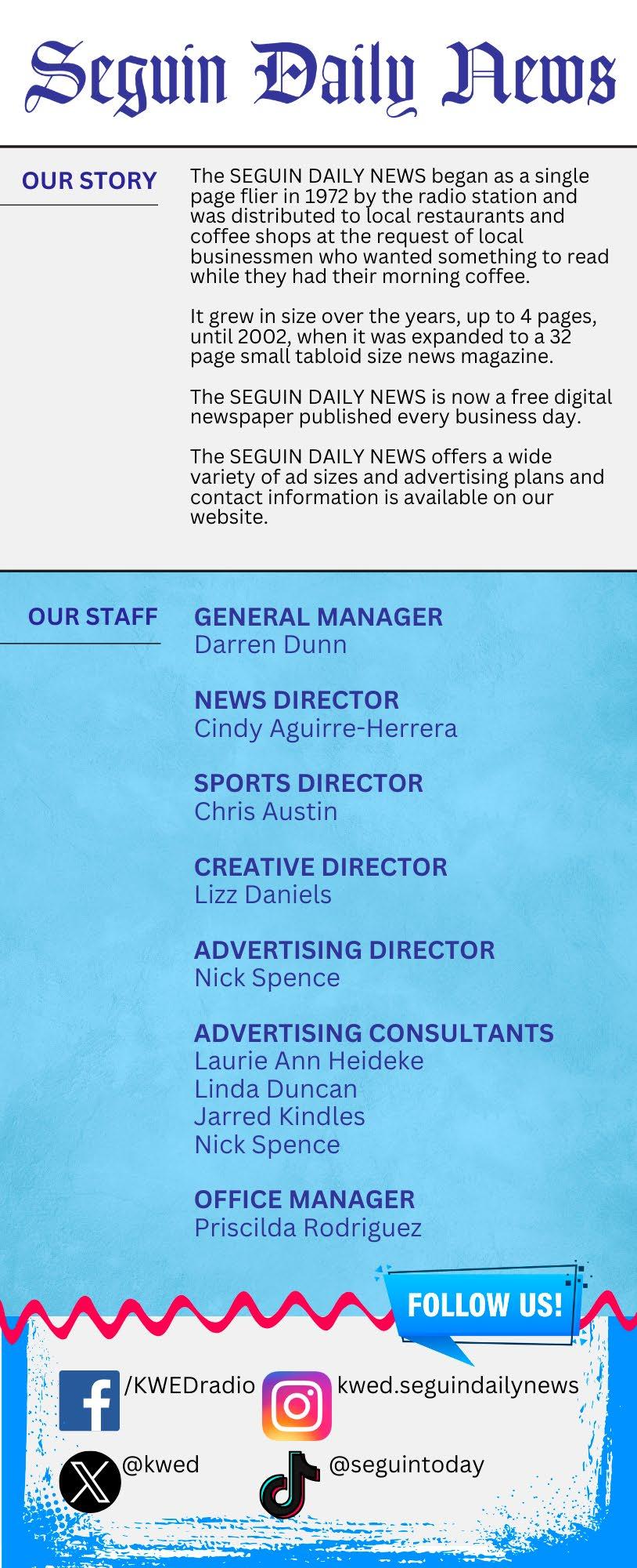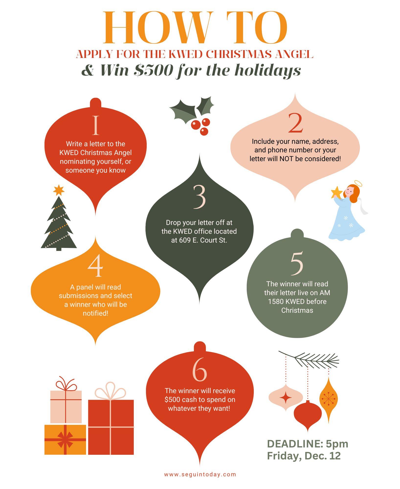 KWED Radio will be hosting its annual Christmas Angel Contest, accepting letters now through 5 p.m. on Friday, Dec. 12, at the KWED studios at 609 E. Court St., offering families in Guadalupe County the chance to nominate themselves or someone they know to receive $500 cash this Christmas. The contest invites residents to submit a letter explaining why a family could use the assistance, with all entries required to include the nominator’s name, address, and phone number; the winning letter will be read live on air before Christmas and featured along with photos in the Seguin Daily News, and entries may also be submitted anytime through the studio’s front-door drop slot.