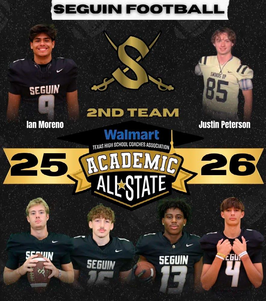 Seguin High School placed two studentathletes on the Academic All-State Second Team: Ian Moreno and Justin Peterson. Earning Honorable Mention recognition were Ryan Lee, Marcus Troy, Elliot Weaver, and Corey Dailey.