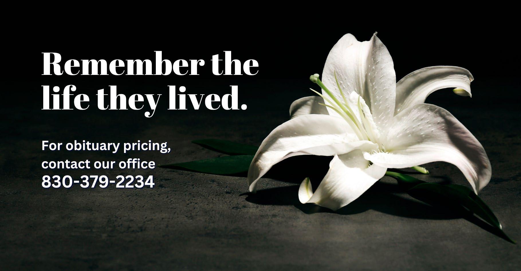 Memorial contributions may be made to the American Cancer Society, c/o Jeanette Siltmann, 196 Townesend Rd., Seguin, Texas, 78155. You are invited to sign the guest book at www.treshewell.com. Arrangements are under the direction of Tres Hewell Mortuary, 165 Tor Dr., Seguin, Texas, 78155, 830-549-5912.