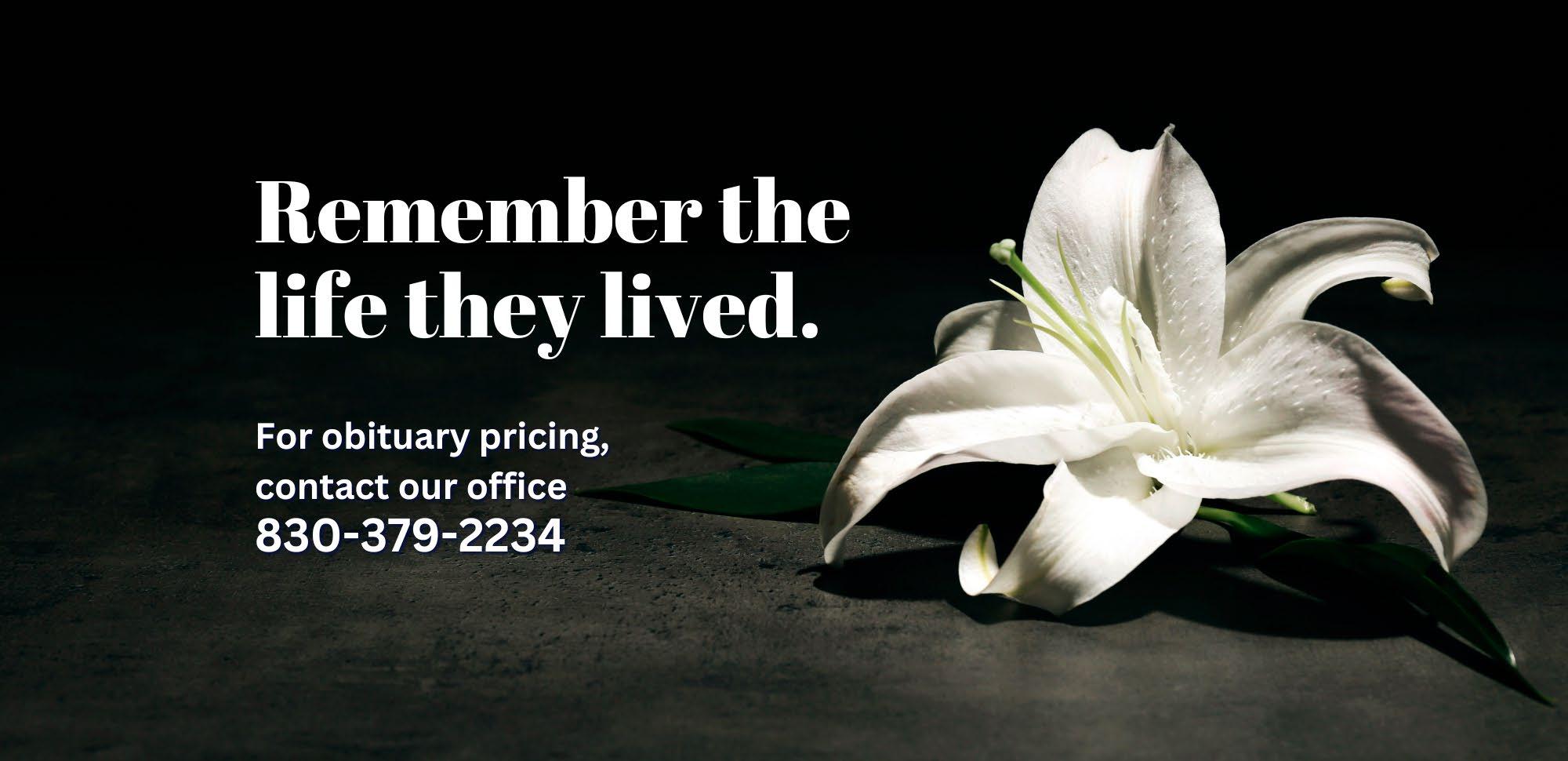 Funeral arrangements are under the care of Palmer Mortuary and Cremations located at 1116 N. Austin Street, Seguin, Texas 78155; 830.379.9430. Please log on to www.palmermortuary.com to sign and view the guest book.