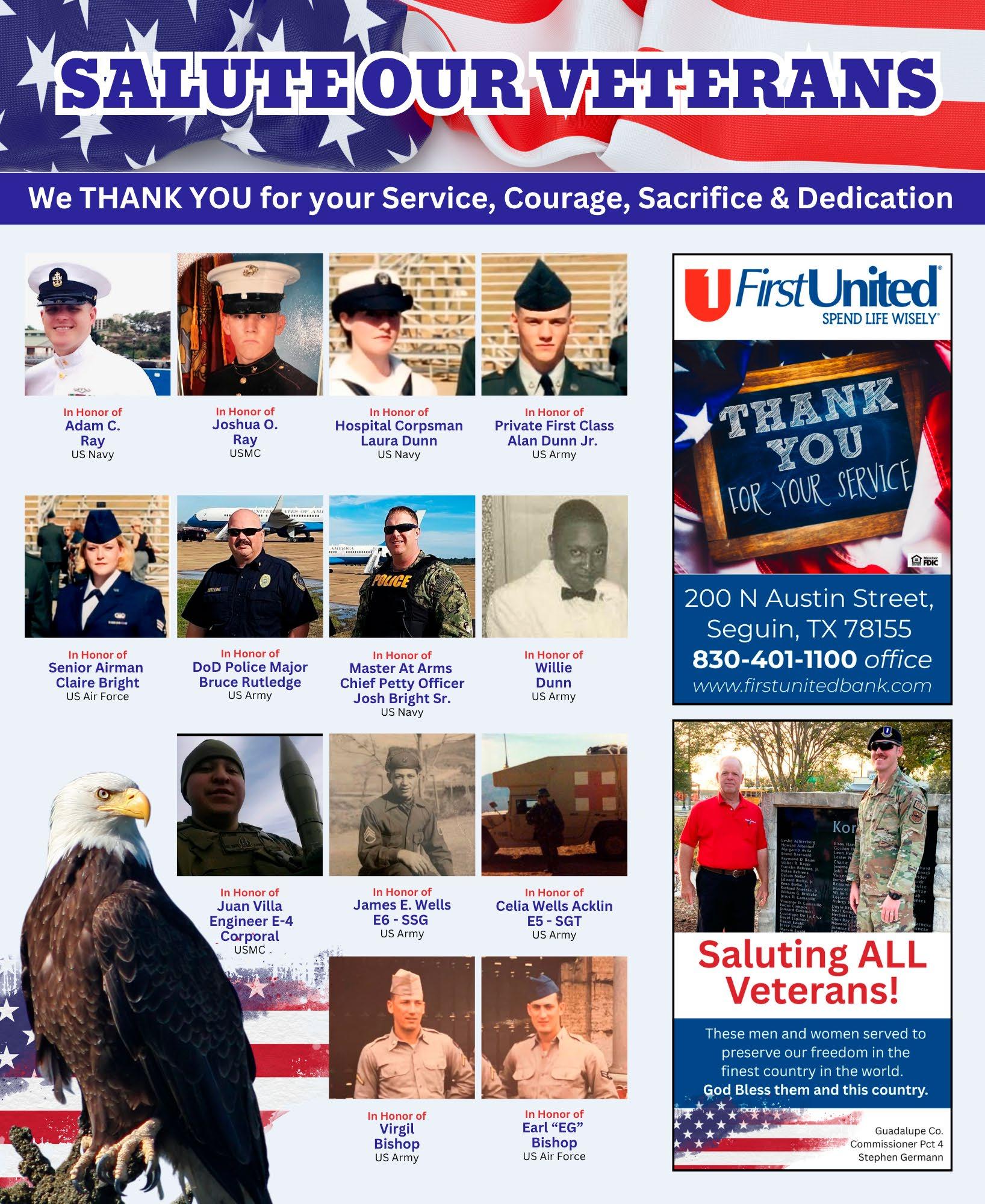 The Seguin Field of Honor® will be hosting its annual flag display featuring 300 flags at Smokey Joe Williams Ball Field from November 11 through November 15, open 24 hours a day. Flags may be sponsored or dedicated for $35 each, with proceeds benefiting the Doug Herrle DAV Chapter 61 in Seguin to help defray the cost of the Veterans Wall. Volunteers are needed to assemble flags at 10:00 AM on Sunday, November 9, at MidWay Hall, and to assist with setup beginning at 7:30 AM on Monday, November 10. The Veterans Day Parade will begin at 9:00 AM on Tuesday, November 11, followed by an assembly at the Seguin Coliseum and Opening Ceremonies at the field, featuring speakers, music, food trucks, and a 12:30 PM helicopter flyover.