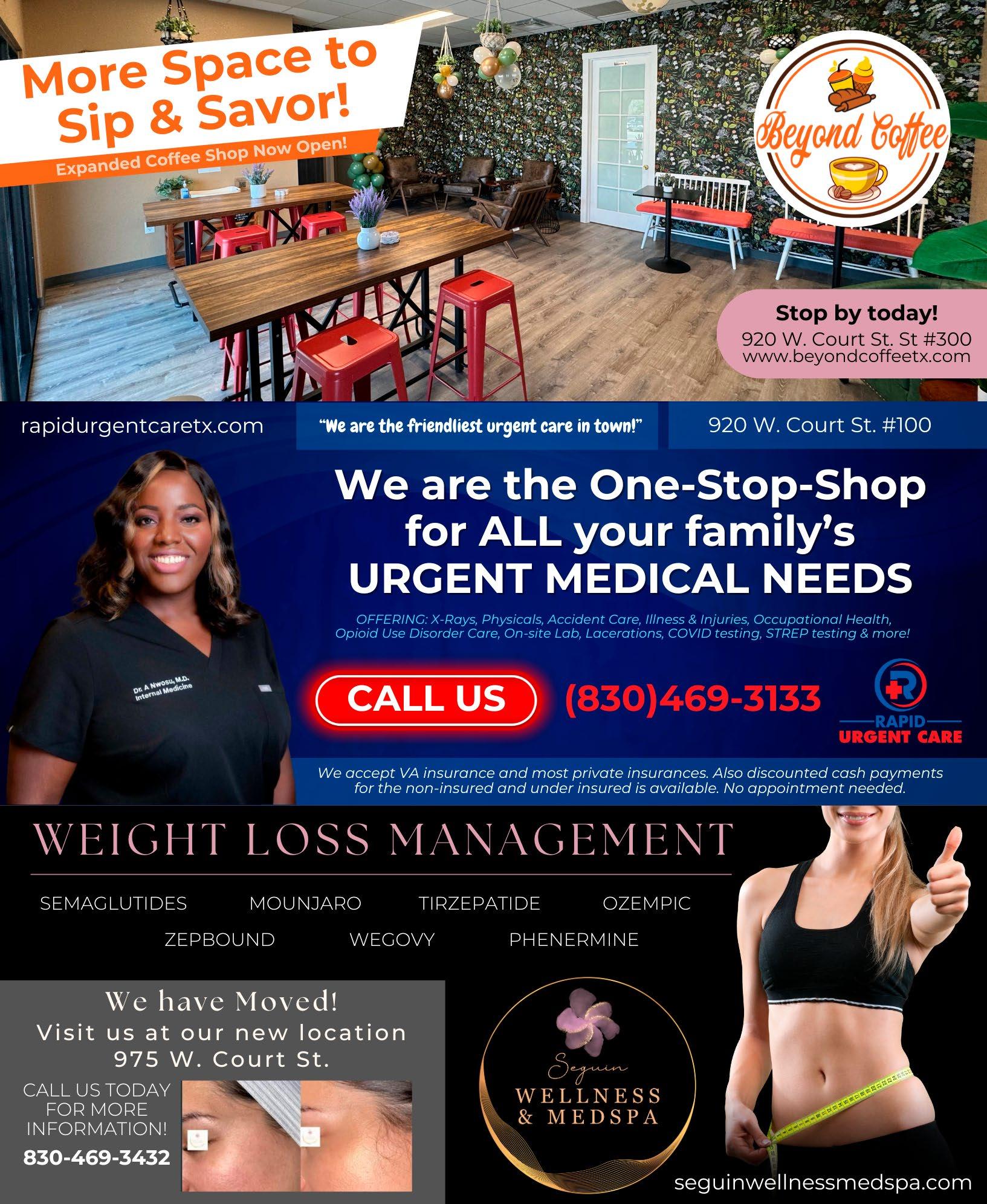 Spooktacular Fall Fest & Health Fair 3 to 6 p.m. Saturday, Oct. 25 at Beyond Coffee, Rapid Urgent Car, and Seguin Wellness & MedSpa at 920 W. Court St. Pumpkin patch photo, candy, cookie and pumpkin decorating plus health screenings.