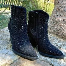 Suede, black, hand-embroidered rose details.