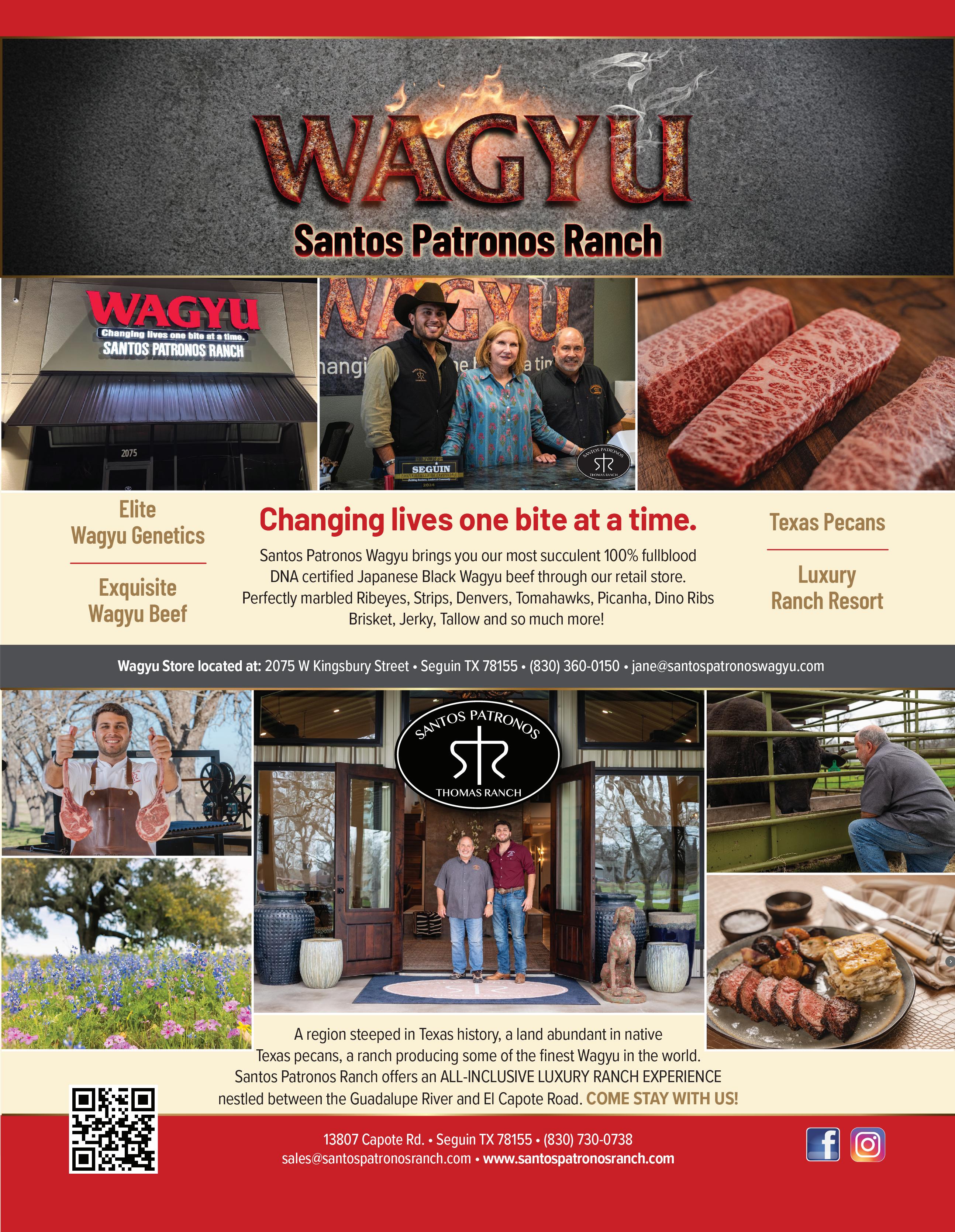 In the southeastern portion of Guadalupe County sits a family-owned ranch that blends tradition with sustainability, offering a haven of luxury and environmental stewardship. Now owned by the Thomas family, the Santos Patronos Ranch — a worldclass Wagyu ranch — sits on land once part of the historic El Capote Ranch. Originally granted to French officer Count Jose De La Baume, who acquired 27,000 acres in Texas after the American Revolution, the land was confiscated due to tensions between Spain and Mexico. With the help of Texas leaders, he regained the property in 1828. After De La Baume's death in 1834, El Capote Ranch was divided among his heirs