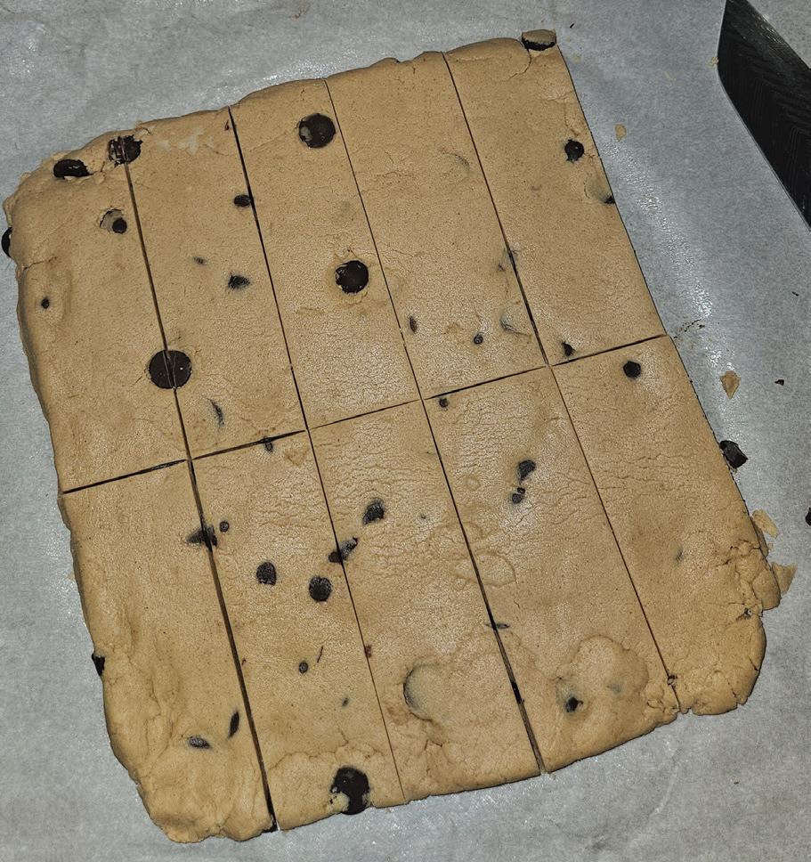 4: Cut the large “dough” square into candy bar-sized rectangles and dip into the chocolate. Place the dipped bars back onto the baking sheet and place back into the fridge to set.