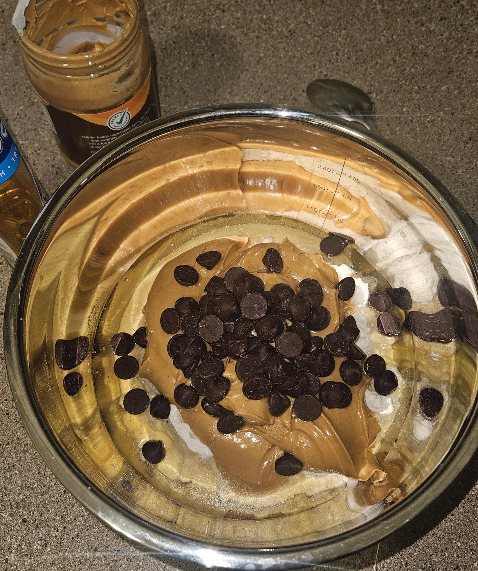 1: In a large mixing bowl, mix together all of the ingredients except for the melting chocolate. Don’t be afraid to mix with your hands if it gets too hard otherwise. Once mixed thoroughly, it should have a consistency similar to cookie dough.
