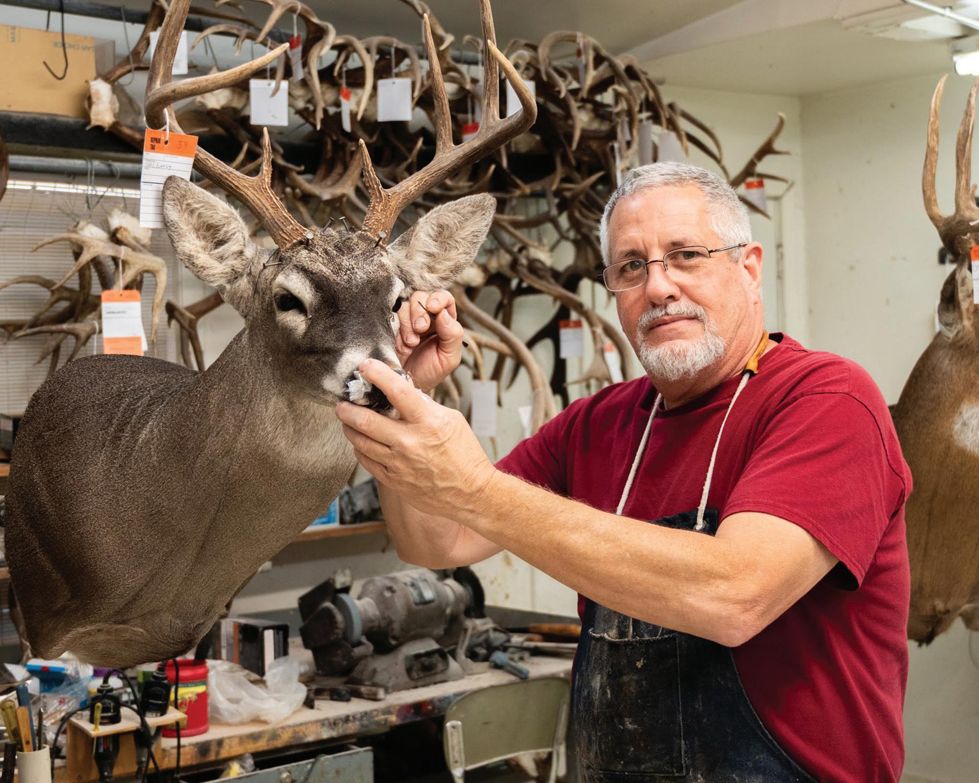 likely to be greeted like a longtime friend than a customer. His easygoing nature and genuine interest in people have become as much a part of his reputation as his lifelike mounts.