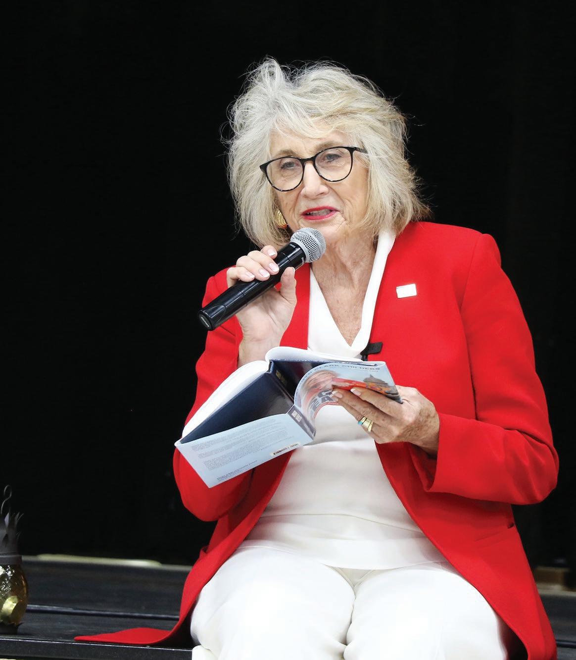LEFT: Retired Secret Service Agent Kathryn Childers reads an excerpt from her book “Scared Fearless: The Book!” LEFT: An attendee at the Women of Influence’s Hats Off To Her Gala shows off her balloon animal hat during the hat contest.