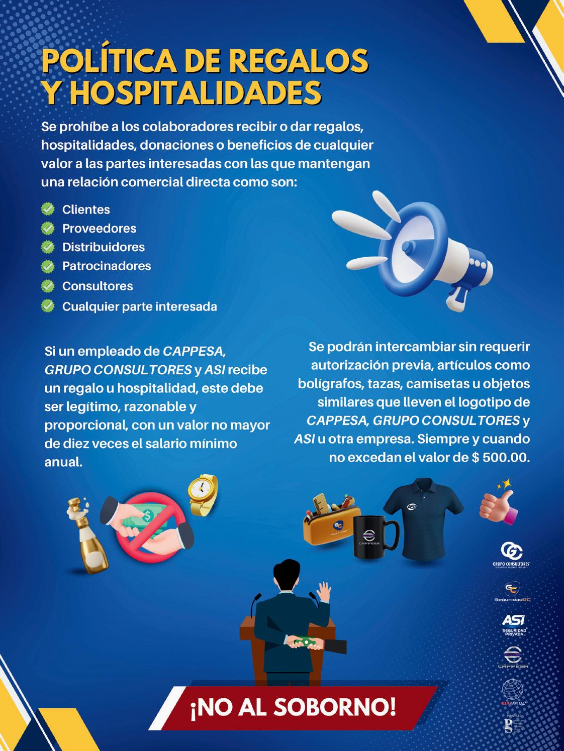 dicada a la prestación de servicios de Seguridad Privada Integral, comprometido a mantener la integridad de los procesos reduciendo la probabilidad y consecuencias, respecto a la prevención de delitos de corrupción, soborno, lavado de activos y eventos perjudiciales e indeseables, entre otros. Comprometidos a cumplir los requisitos legales aplicables, reglamentarios y otros requisitos. Garantizando el respeto a los principios de responsabilidad social a través de la rendición de cuentas, transparencia, comportamiento ético, respeto a los grupos de interés, respeto a la vida humana y dignidad, respeto al principio de legalidad, a la normativa internacional de comportamiento y respeto por los derechos humanos. Promoviendo la seguridad en el uso de tecnologías de la información.