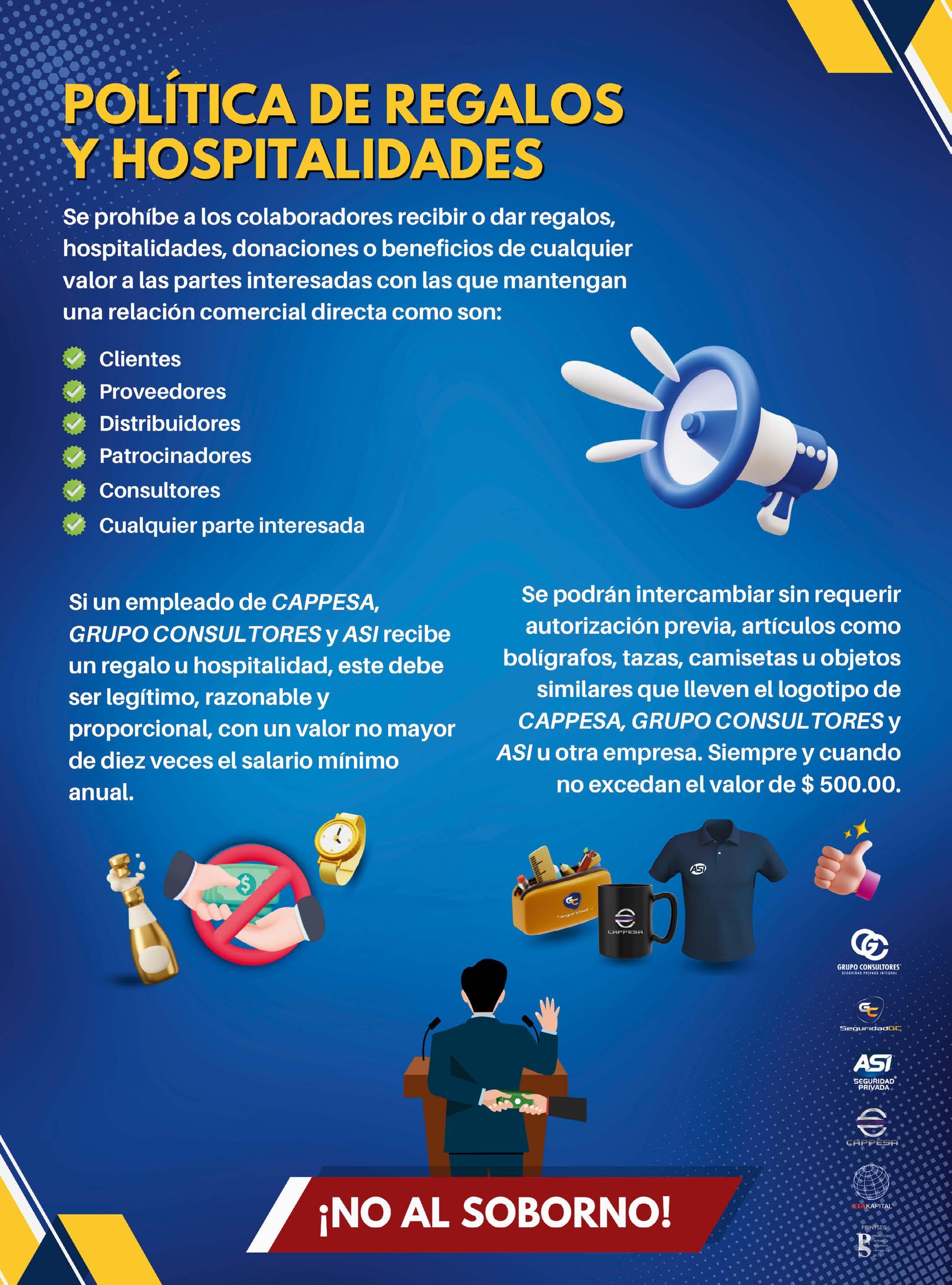 Grupo Consultores, empresa dedicada a la prestación de servicios de Seguridad Privada Integral, comprometido a mantener la integridad de los procesos reduciendo la probabilidad y consecuencias, respecto a la prevención de delitos de corrupción, soborno, lavado de activos y eventos perjudiciales e indeseables, entre otros. Comprometidos a cumplir los requisitos legales aplicables, reglamentarios y otros requisitos. Garantizando el respeto a los principios de responsabilidad social a través de la rendición de cuentas, transparencia, comportamiento ético, respeto a los grupos de interés, respeto a la vida humana y dignidad, respeto al principio de legalidad, a la normativa internacional de comportamiento y respeto por los derechos humanos. Promoviendo la seguridad en el uso de tecnologías de la información.