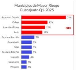 En el primer trimestre 2025, el Estado de Guanajuato concentro 11% del robo de carga a nivel nacional posicionándose como la tercera entidad con mayor robo de carga en México. 56% de los delitos se concentraron en dos autopistas, la Querétaro-León (MEX-45D) que conecta al estado de Querétaro con Jalisco y cruza por el corredor industrial, y la QuerétaroSan Luis Potosí (MEX-57D), que es la principal vía de conexión con la frontera norte con Estados Unidos en Nuevo Laredo.
