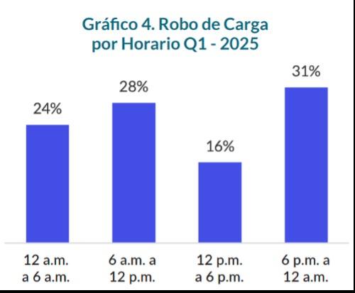 El horario con mayor riesgo para el transporte de carga durante el Q1-2025 se dio en la noche entre las 18:00 hrs. y las 24:00 hrs. con 31% de los incidentes.