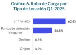 El robo de carga continúa como una de las principales problemáticas que afectan las cadenas logísticas en el país. De acuerdo con lo reportado por el Sistema Nacional de Seguridad Pública (SNSP) en el primer trimestre 2025, 81% de los robos a transportistas presentaron algún tipo de violencia, indicando que al menos en ocho de cada diez robos de carga se materializó algún tipo de conducta violenta.