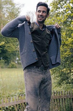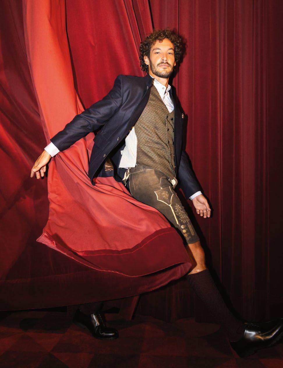 Shawnee trägt ein Sakko aus Schurwolle von WINDSOR um € 699,- und ein Gilet aus Baumwolle und Leinen von GOTTSEIDANK um € 299,- zur Ziegenlederhose von MEINDL um € 990,-. Das Stehkragenhemd ist von SEIDL um € 129,-, die Wollstutzen sind von LUISE STEINER um € 135,- und die Schuhe von DIRNDL+BUA um € 339,-.