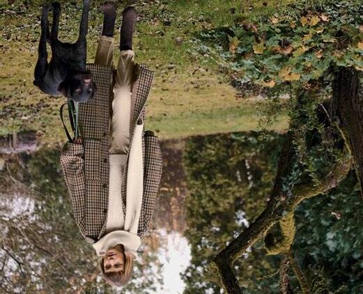 Charline in einem Jacquard-Kleid von MOTHWURF um € 790,-, darüber ein Samtblazer von TBA LIFE um € 649,- und ein taillierter Regenmantel mit Kapuze von RAINSISTERS um € 329,-. Das Ledertäschchen stammt von WEAT um € 145,-. Kropfcollier, Ohrstecker und Gürtel sind von SEENBERG um € 229,-, € 119,- und € 259,-.
