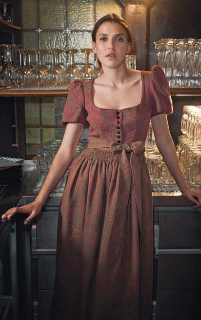 Charline trägt ein Dirndl mit Leinenoberteil, Baumwollrock und Seidenschürze von TOSTMANN um € 1.490,- und eine Dirndlbluse von ELISABETH & FRANZL um € 240,-. Ihre Strickjacke aus Kaschmir und Seide stammt von LU REN um € 585,-, der Unterrock von SPORTALM um € 199,-. Der Schal aus Viskose und die Handtasche sind von LUISE STEINER um € 89,90 und € 139,-. Ihr handgehäkelter Halsschmuck ist von RITA IN PALMA um € 299,-, die Ohrstecker sind von MASCHALINA um € 130,- und die Velourlederpumps von XAVER LUIS um € 169,-. (Outfit siehe auch Cover)