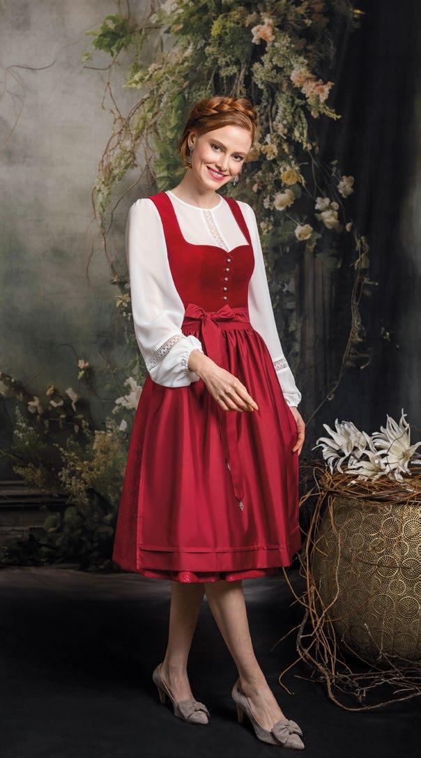 Kleider, die die Welt bedeuten: Dirndl schmücken weiterhin in Midi-Länge und verleihen Haltung und Ausdruck dank Samt und Seide. Glänzend!