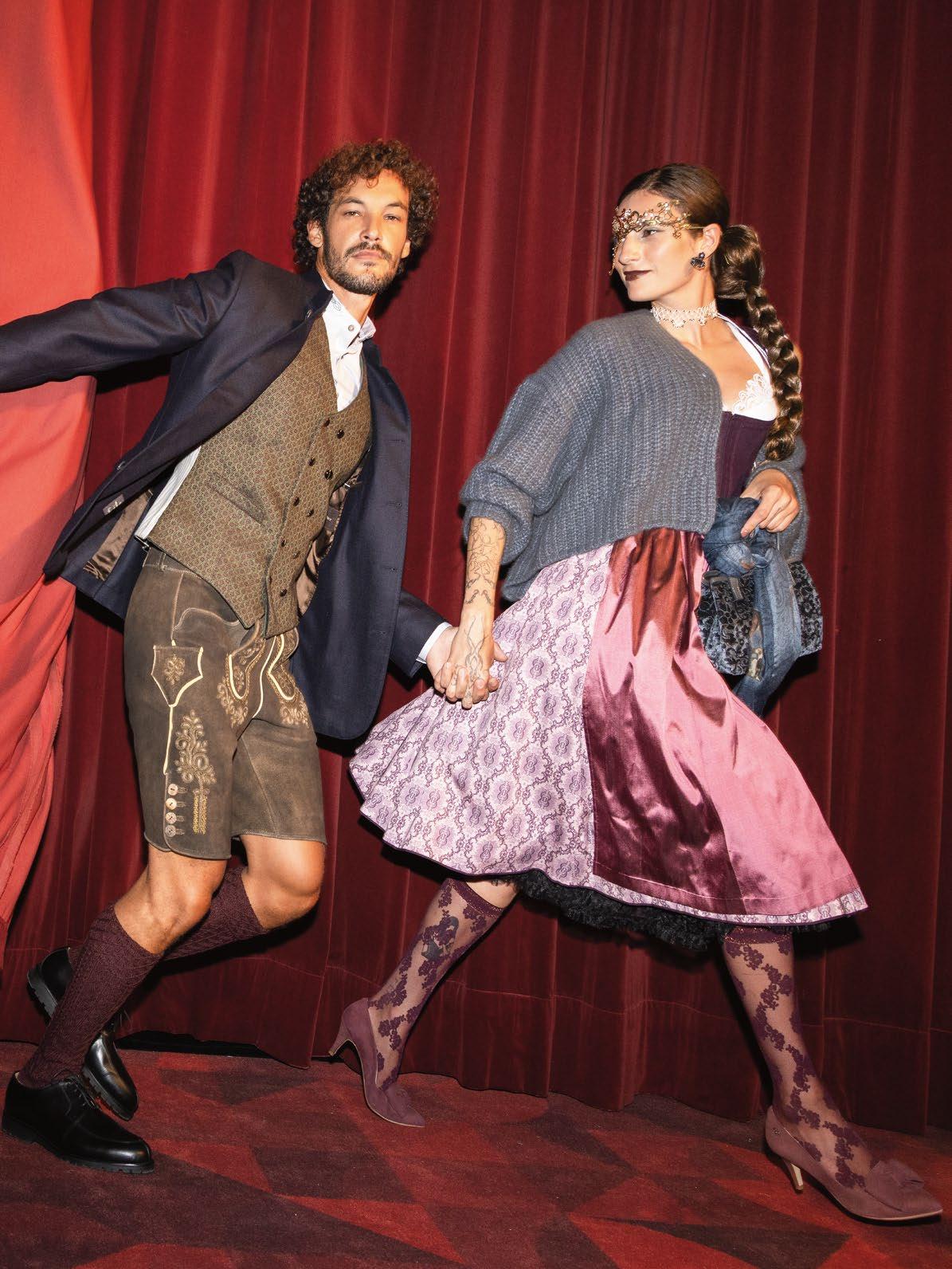 Charline in einem Festtagsdirndl mit Samtoberteil, Seidenrock und Seidenschürze von TOSTMANN um € 1.790,- und einer Dirndlbluse aus Seiden-Mix von WALLMANN um € 259,-. Ihre Dreieckstola ist aus reinem Kaschmir von DADDY‘S DAUGHTERS um € 329,-, die Velourlederpumps sind von DIRNDL+BUA um € 249,- und die Ohrstecker von SEENBERG um € 139,-. Shawnee trägt ein Sakko aus BaumwollMix um € 598,- und ein Gilet aus einer Wolle-Seiden-Mischung um € 298,-, beides von LANDGRAF. Dazu das Galahemd CONSTANTIN mit Doppelmanschette um € 179,- und die Hirschlederhose von BECKERT um € 1.499,-. Die Seidenkrawatte ist handbedruckt von SEPP WACH um € 89,-, das Einstecktuch aus Seide von STRIESSNIG um € 39,- und die Manschettenknöpfe stammen von MERCHEN MEDCHEN um € 79,-. Die Stutzen aus Wolle und Baumwolle sind von GÖSSL um € 185,- und die Schuhe von DIRNDL+BUA um € 259,-.