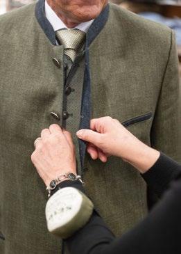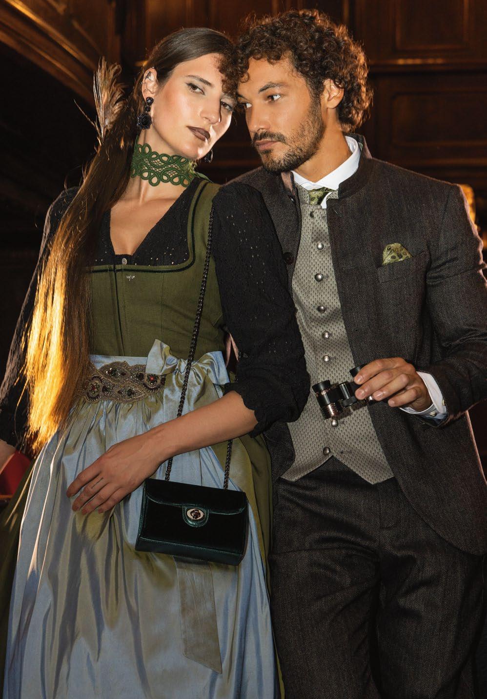 Charline im langen Festtagsdirndl mit Leinenoberteil, Baumwollrock und Seidenschürze von PLOOM um € 990,- und der Dirndlbluse von SPORTALM um € 199,-. Dazu trägt sie einen Gürtel von TBA LIFE um € 329,-, ein Kropfband von MOTHWURF um € 55,- und eine Samttasche von KINGA MATHE um € 399,-. Die Ohrstecker sind von MASCHALINA um € 180,-. Shawnee in einem Sakko aus Woll-Mix um € 549,- mit passender Hose um € 299,-, beides von LUIS TRENKER. Sein Festtagsgilet stammt von PLOOM um € 349,-, das Hemd mit Hornknopf von DU4 um € 179,-, die Seidenkrawatte um € 59,90 mit dem passenden Stecktuch um € 29,90 sind von LUISE & LOIS.
