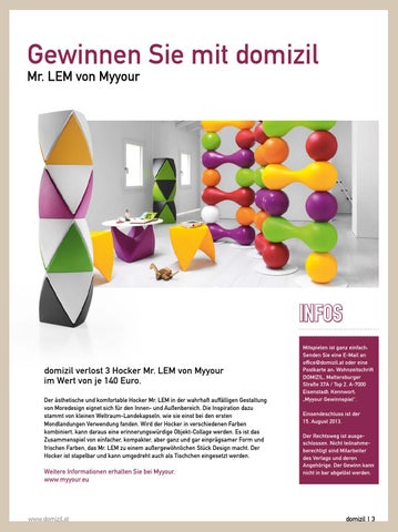 Mitspielen ist ganz einfach: Senden Sie eine E-Mail an office@domizil.at oder eine Postkarte an: Wohnzeitschrift DOMIZIL, Mattersburger Straße 37A / Top 2, A-7000 Eisenstadt; Kennwort: „Myyour Gewinnspiel“. Einsendeschluss ist der 15. August 2013. Der Rechtsweg ist ausgeschlossen. Nicht teilnahmeberechtigt sind Mitarbeiter des Verlags und deren Angehörige. Der Gewinn kann nicht in bar abgelöst werden.