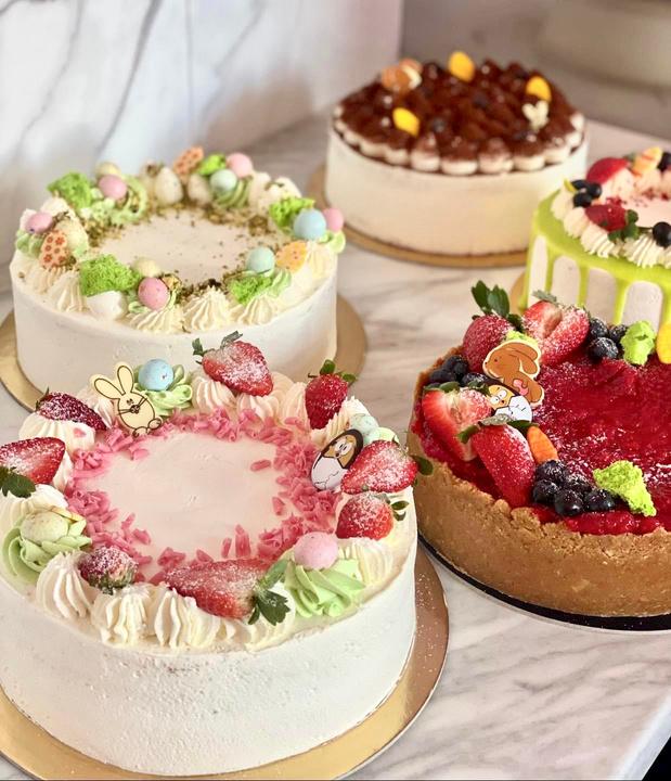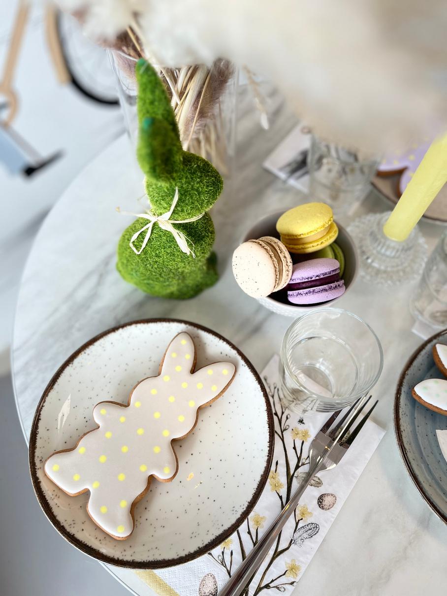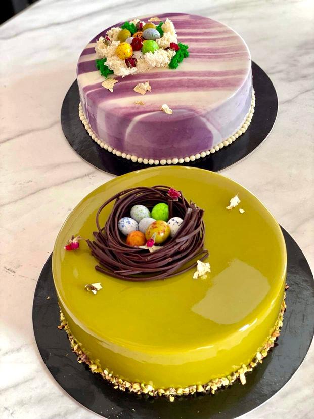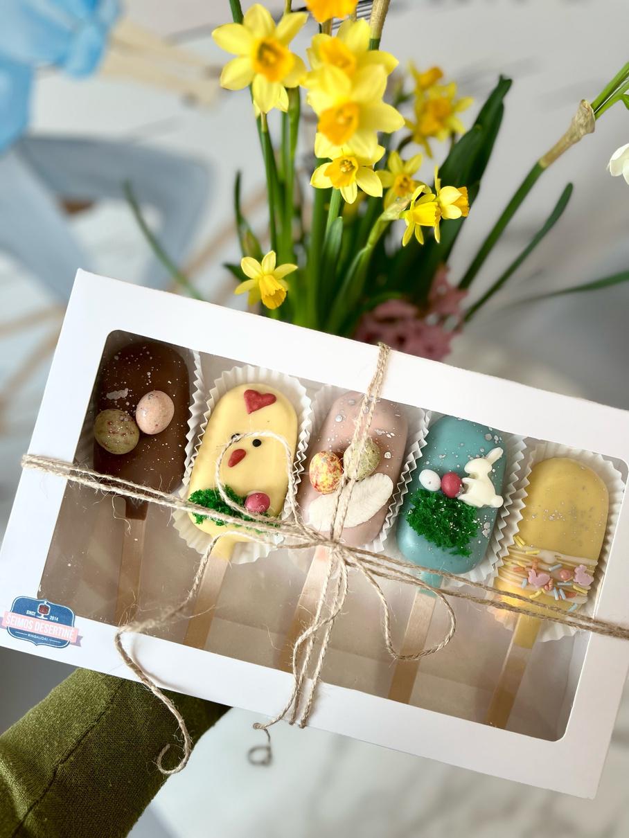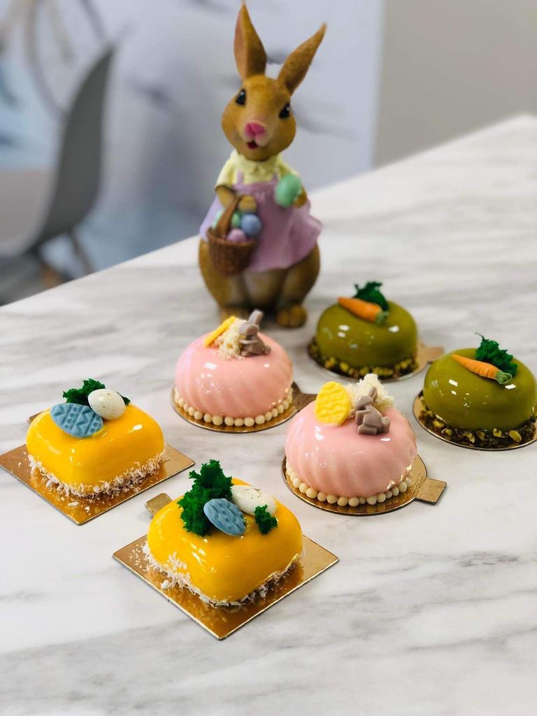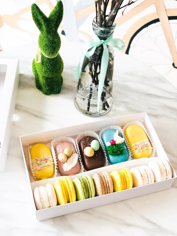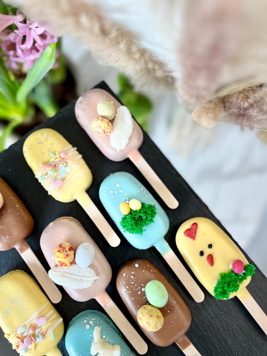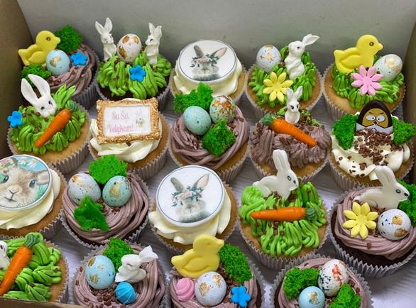 Spalvingi pyragaičiai iš mūsų asortimento, papuošti su Velykiniais akcentais.