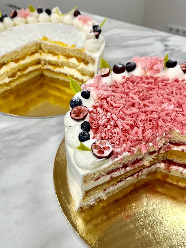 (Šie tortai ypač jautrūs šilumai, negali ilgai būti kambario temperatūroje. Šiuos tortus ypač svarbu laikyti šaldytuve!)