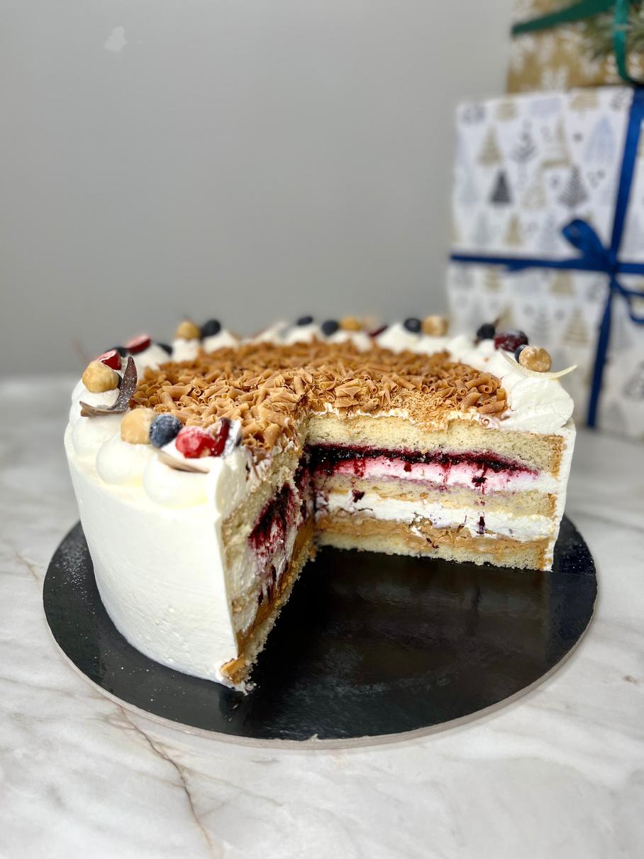 (Vaniliniai biskvitai, maskarponės - grietinėlės kremas, karamelinis kremas, kepinti lazdynų riešutai, juodųjų serbentų džemas)