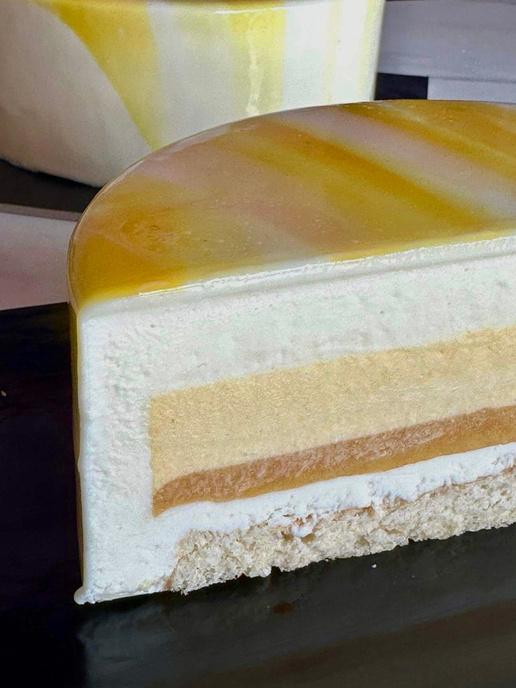 (MIGDOLINIS BISKVITAS, EGZOTINIŲ VAISIŲ KREMO SLUOKSNIS, EGZOTINIŲ VAISIŲ CONFI SLUOKSNIS, BALTOJO ŠOKOLADO LENGVI PUTĖSIAI)